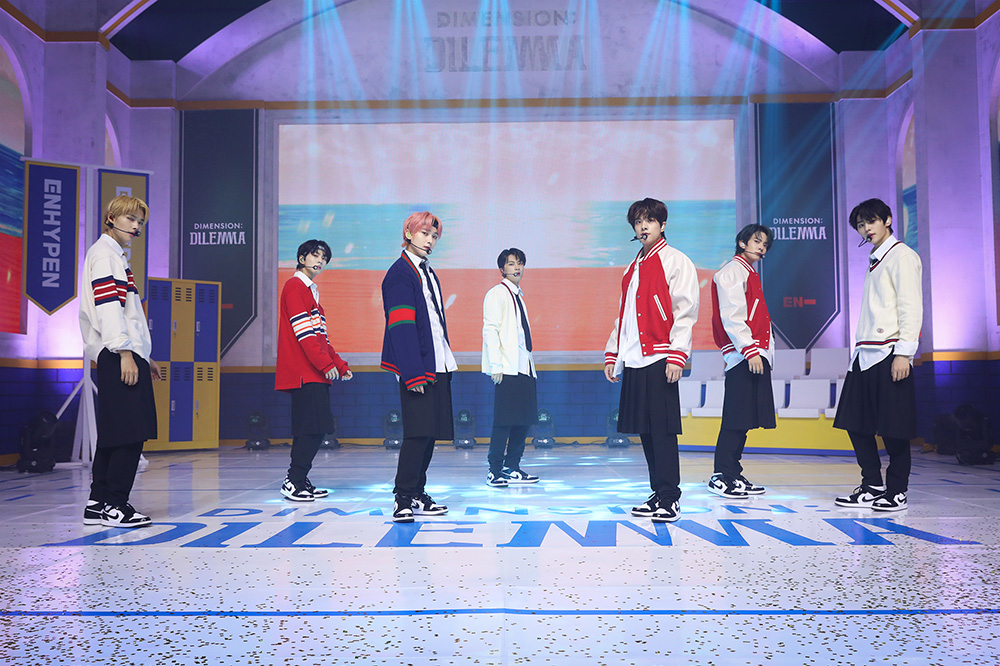 この日、「Tamed-Dashed」の初ライブパフォーマンスも行われたが、スタジャンやVネックカーディガンを身にまとったスクールボーイ姿のENHYPENががっちりスクラムを組む振りからスタート。爽快なサウンドに乗って、活き活きとしたボーカルと躍動感溢れるダンスを披露。