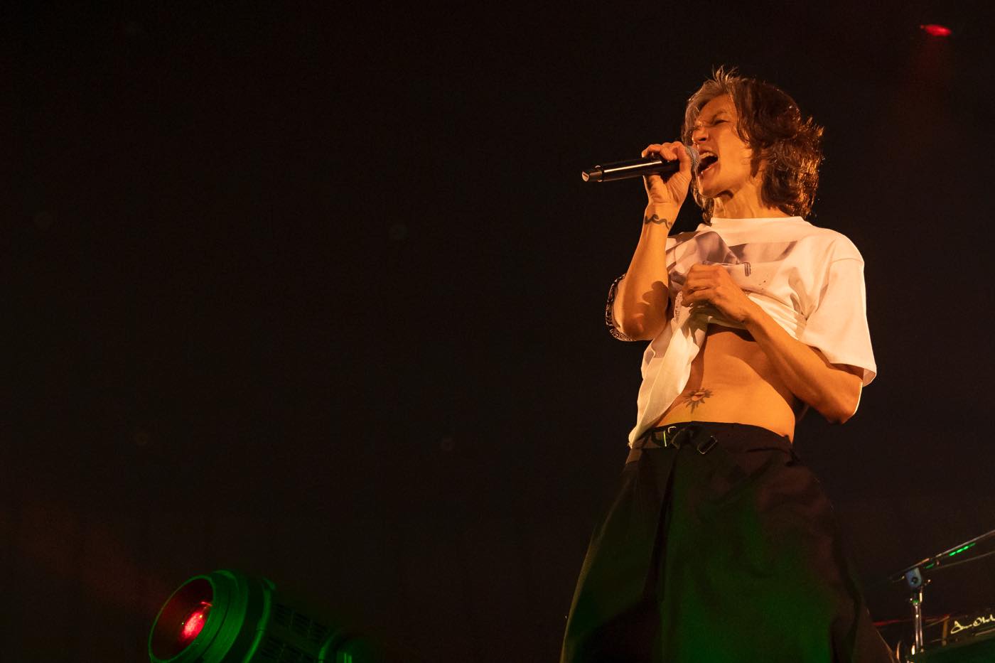 わかってはいたが、このシンプルなスタイルで歌う姿に触れると、稲葉浩志というボーカリストのすごさに圧倒される。抑え込んだ感情が、“教えて、あとどのくらい”とサビで溢れ出てくると、心が揺さぶられる。マイクの前に置かれたポップガードが、時折、声の圧で震えるのも印象的だった。