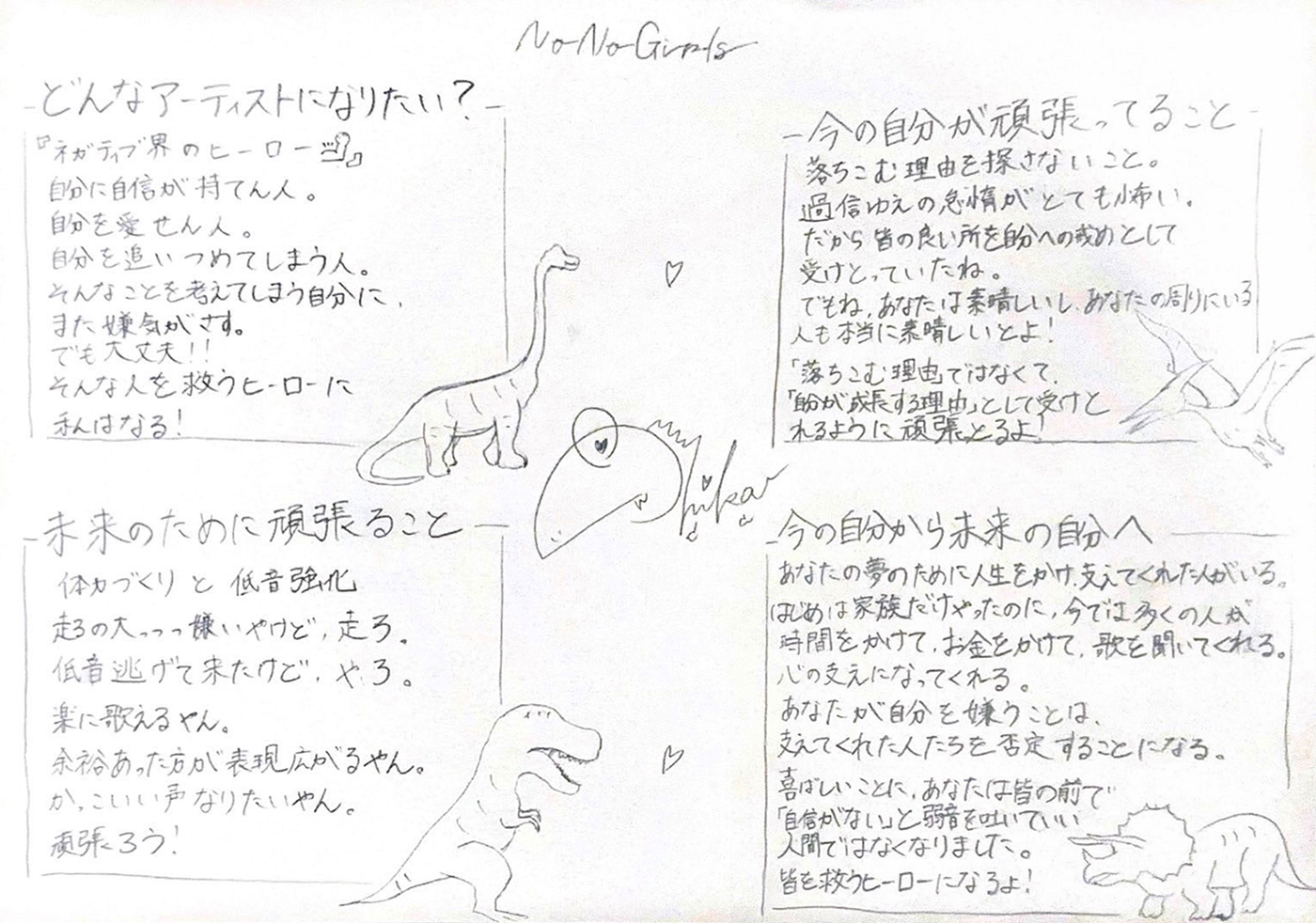 私自身も素直に感情を出したり周りに頼るのが苦手だったけどちゃんみなさんに言っていただいた通り鏡を沢山見たり、周りのメンバーに感情をオープンに話したりして今ではメンバーの中で一番涙脆いんじゃないかっていうくらい感情を出せるようになっているから大丈夫だよ! no no girlsを通して歌、ダンス、人間性について深く考える時間が増えたよね。考えて行動に移した分、絶対に自分の力になっていると感じているからこれからも探究心はずっと持っていてほしいと思います。トライアンドエラーを繰り返して常に上を目指して努力したいと思います。