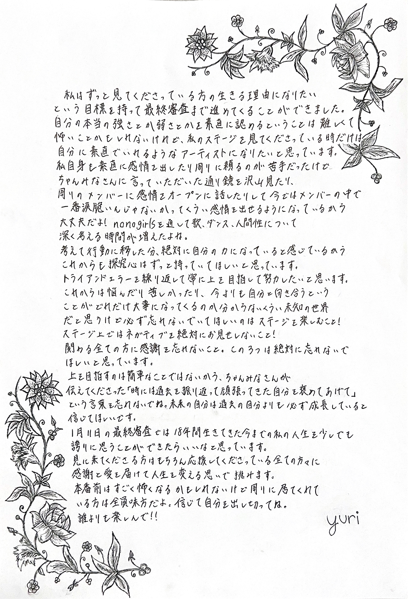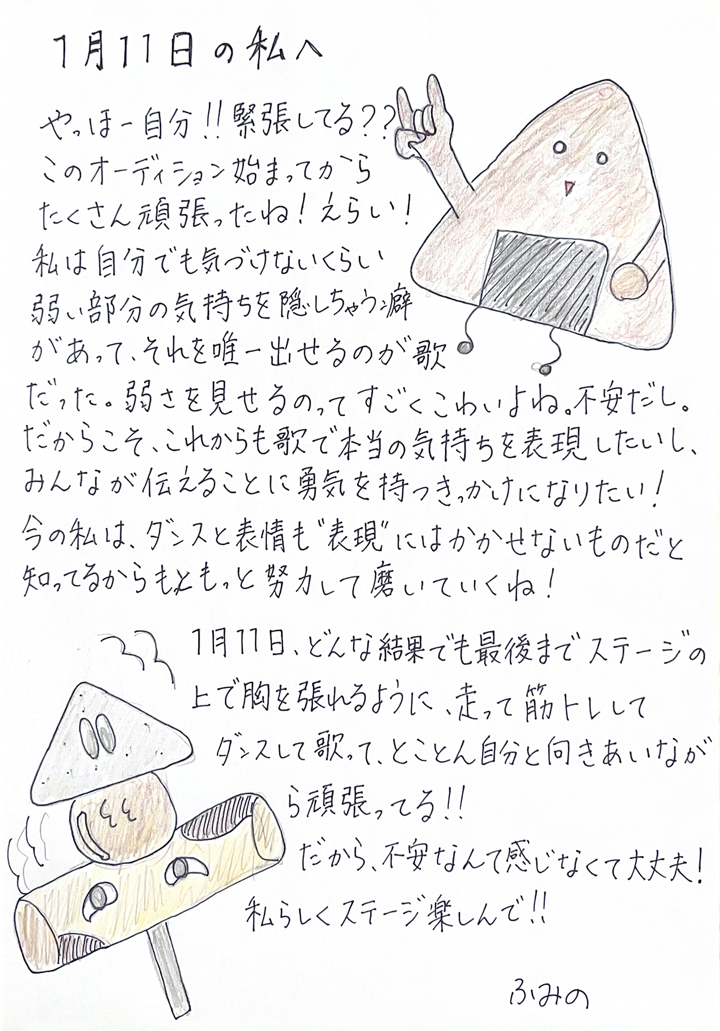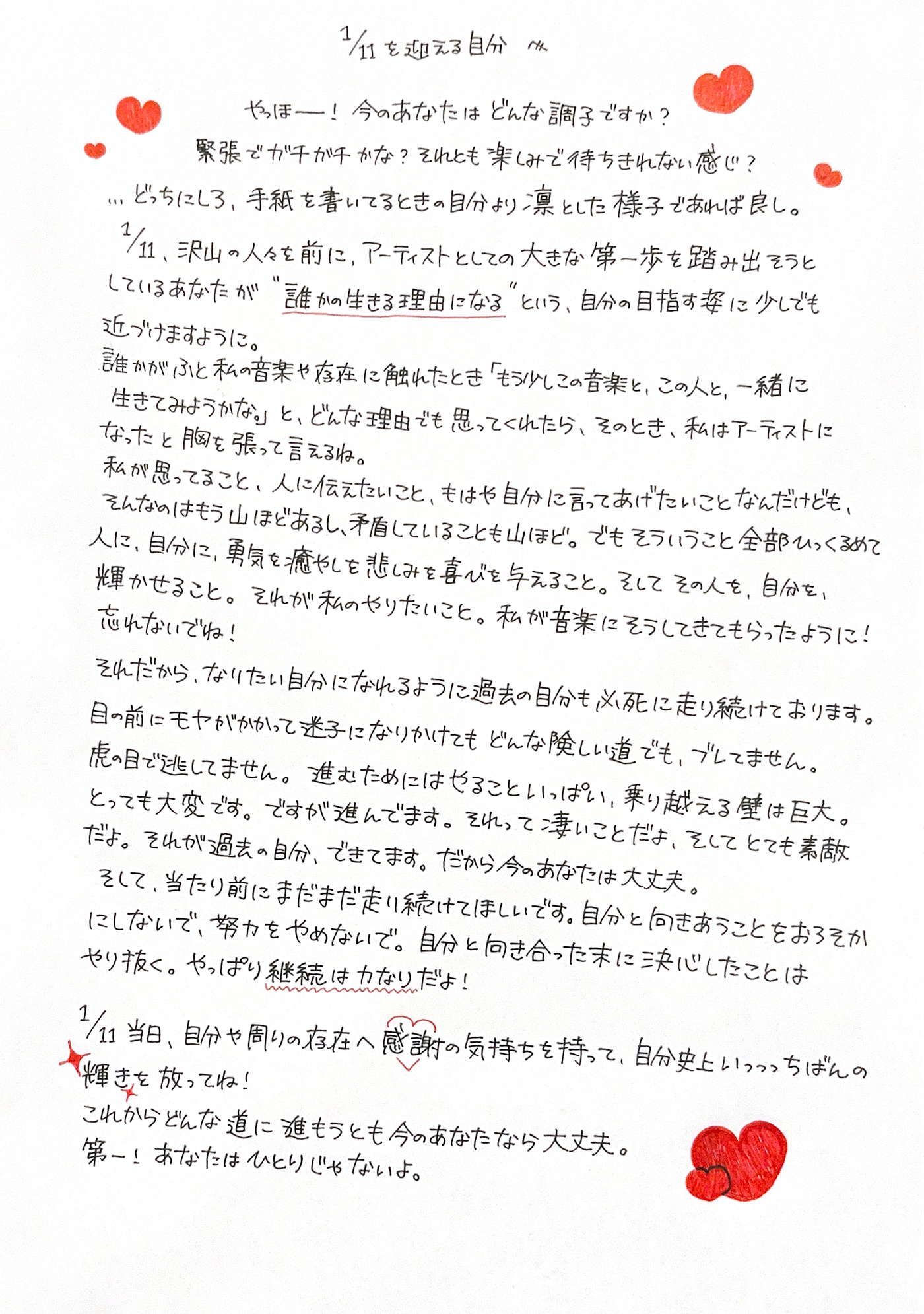 今までの人生で一番がんばった期間だったと思えるように、今の私は全力で毎日を生きてるよ。うまくいかないことも、まだまだ直していかないといけないところもあるけど、ステージに立ったら他のことは考えるな。ファンのみなさんに、メンバーに、支えてくれたスタッフさんに、愛を届けるために死ぬきでやれ。PS.1/11にこの手紙を見てテンション上がるといいなぁ~!! がんばって! 楽しんで!