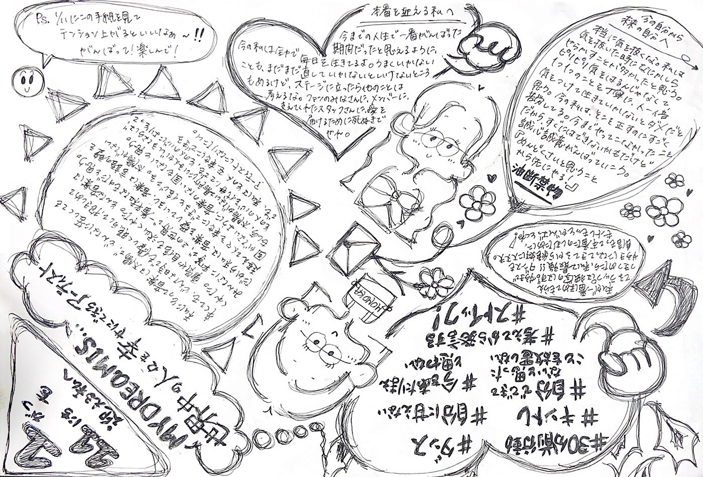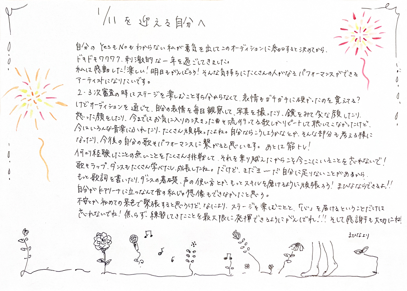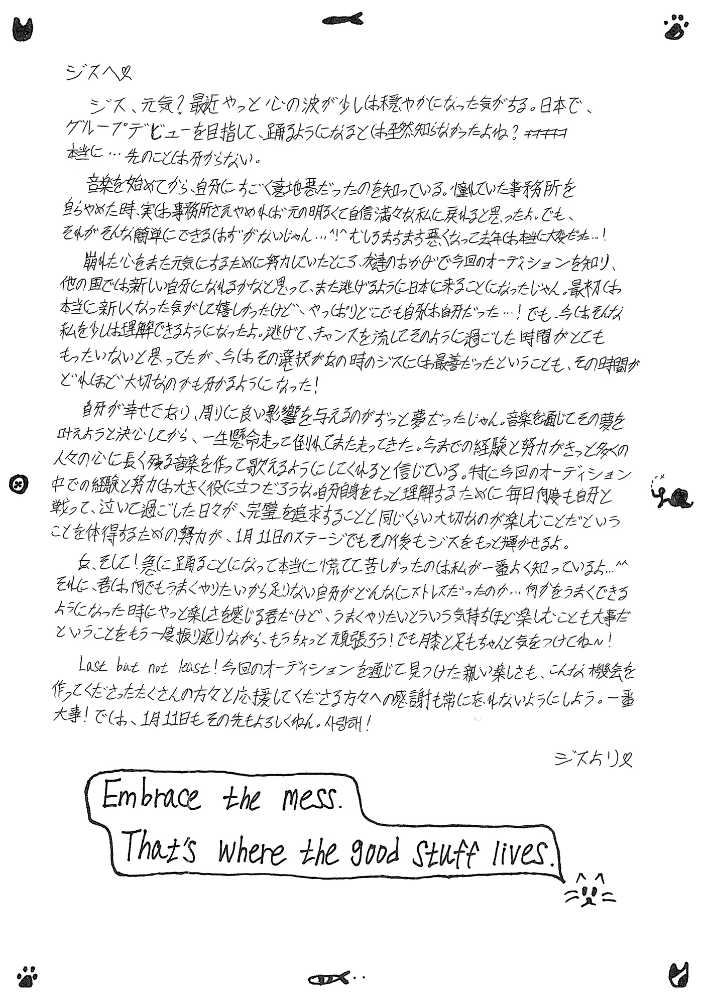 今までの人生で一番がんばった期間だったと思えるように、今の私は全力で毎日を生きてるよ。うまくいかないことも、まだまだ直していかないといけないところもあるけど、ステージに立ったら他のことは考えるな。ファンのみなさんに、メンバーに、支えてくれたスタッフさんに、愛を届けるために死ぬきでやれ。PS.1/11にこの手紙を見てテンション上がるといいなぁ~!! がんばって! 楽しんで!