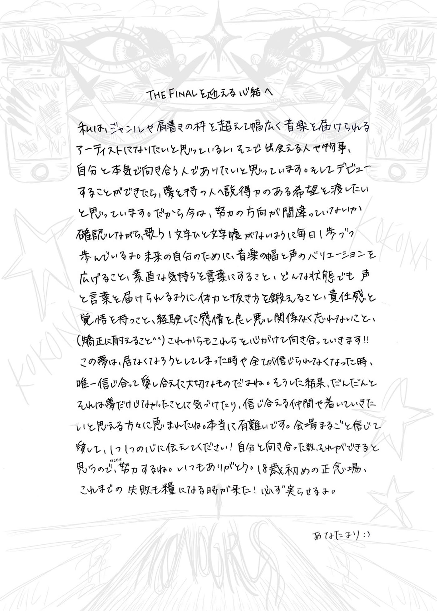 私はずっと見てくださっている方の生きる理由になりたいという目標を持って最終審査まで進めてくることができました。自分の本当の強さとか弱さとかを素直に認めるということは難しくて怖いことかもしれないけれど、私のステージを見てくださっている時だけは自分に素直でいれるようなアーティストになりたいと思っています。