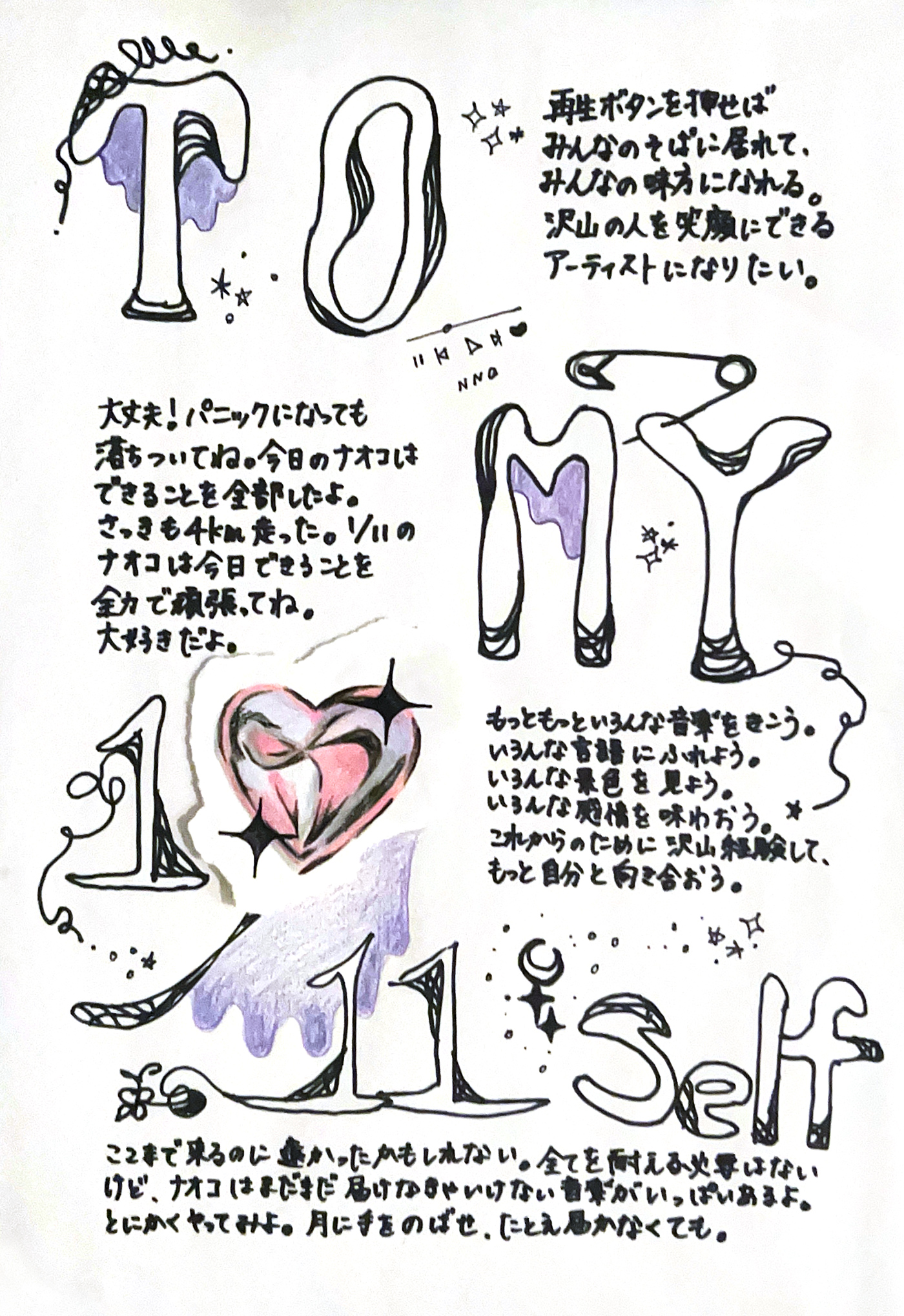 誰かがふと私の音楽や存在に触れたとき「もう少しこの音楽と、この人と、一緒に生きてみようかな。」と、どんな理由でも思ってくれたら、そのとき、私はアーティストになったと胸を張って言えるね。