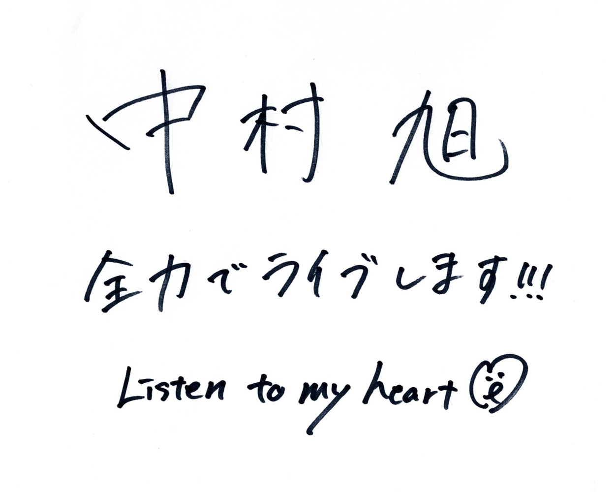 (TOKYO FM SCHOOL OF LOCK! プロデューサー/藤岡泰弘)「自分が伝えたいと思っている気持ちは、これであっているのだろうか」アコースティックギターを片手に、彼女はまるで、自分に問いかけているように歌う。そして中村 旭のライブを目撃した人は「自分が、これだと掴んだことを歌いたい」という、真摯な姿勢そのものに出会う。澄みきった歌声とともに届くこの誠実な態度こそが、私達の心に力強く響くのである。