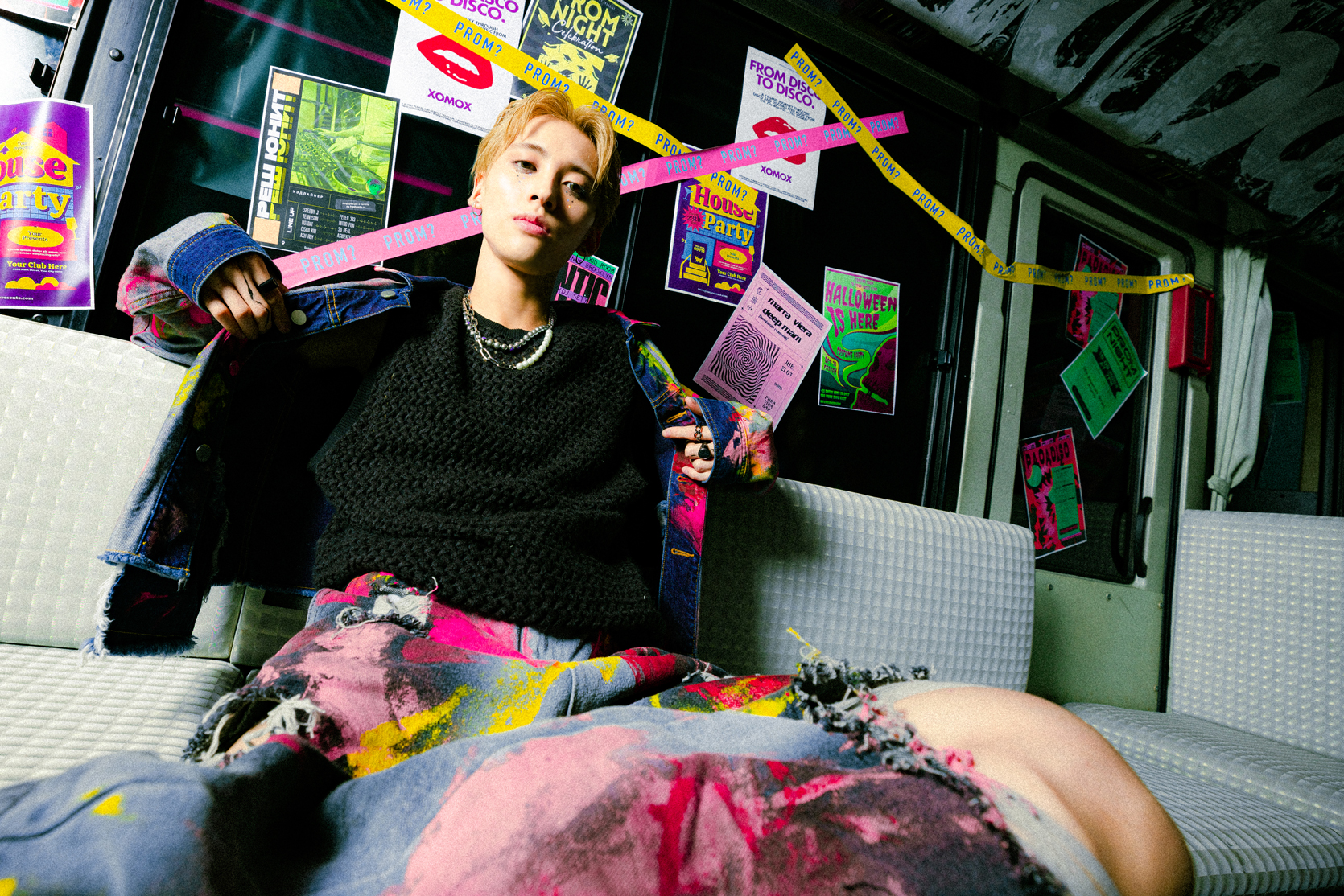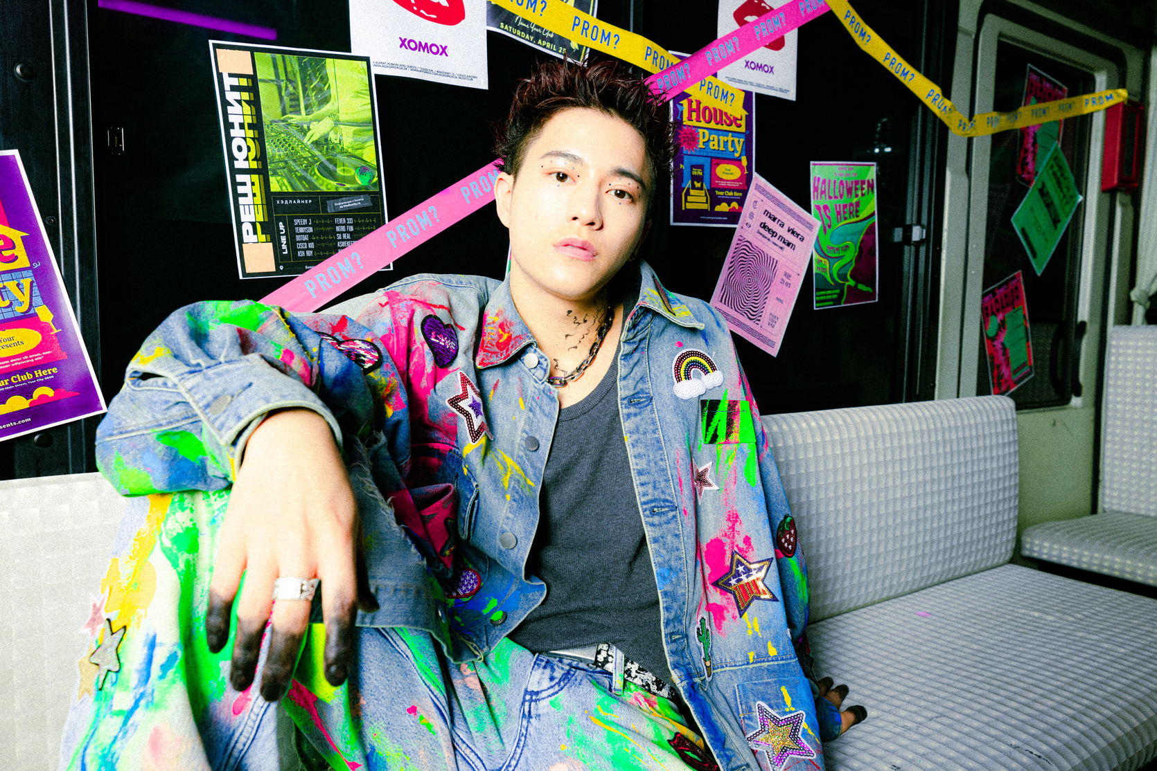 KEIJI:プロムに向かうギラギラのバスで、リップシンクしてるところは、チュッパチャプスも置かれてる中で「トップバッターかますぜ!」みたいな感じで始まって。その後に自分の映像をチェックして、「やばっっ!」て興奮したのをすごく覚えてますね。あとは、個人的には普段、メイクもあんまりしないので、濃いめのメイクをしてもらって、「これ、服とかにつかないのかな?」って思ったりしてました(笑)。