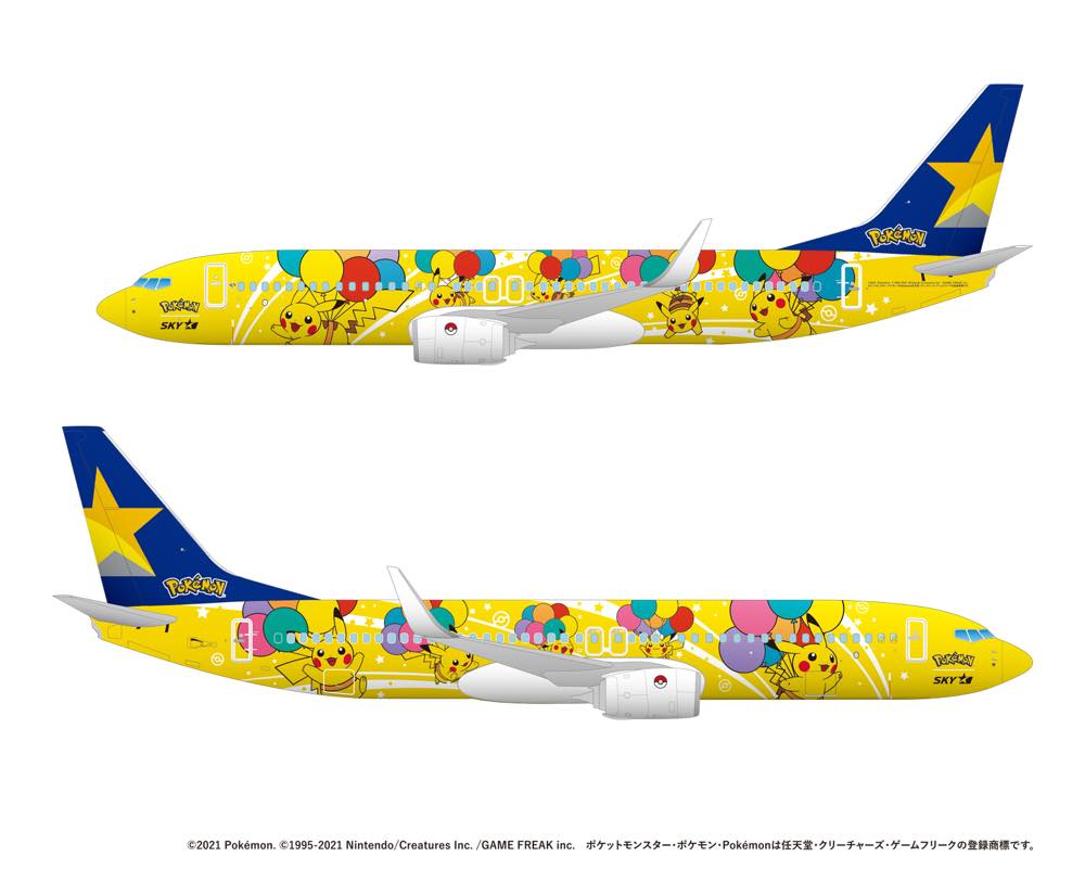 6月21日の羽田―沖縄間の就航が初飛行となる「ピカチュウジェット」は、ピカチュウと同じ黄色でフルペイントされた機体の上に、カラフルな風船を付けた、そらとぶピカチュウが左右に合計10匹描かれ、今後は沖縄(那覇・宮古(下地島))発着路線を中心に、スカイマーク便が就航する他の空港へも運航が予定されている。
