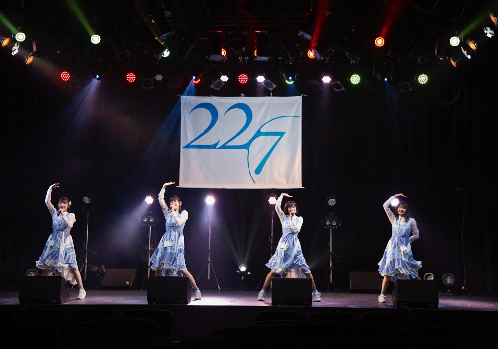 生配信は、ロビーの映像からスタート。会場の扉が開くと、メンバーによる開演前アナウンスが流れ始める。そしてステージ前の最前席まで到着し、「22/7」のバックドロップを見上げると、そのまま会場が暗転し、Overtureへ。無観客配信ながら、当時の定期公演の思い出をなぞりながら、実際に会場に訪れているような演出に、配信を見ていたファンも盛り上がった。