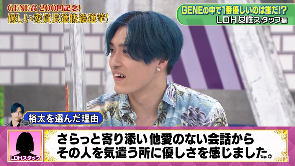 7月4日、ABEMA「ABEMA SPECIALチャンネル」にて放送された、レギュラー番組『GENERATIONS高校TV』内で、本番組の放送200回を記念した特別企画として、GENERATIONSの中でいちばん優しい人を決める「優しい委員長選抜総選挙」を実施。秘密裏に行われた、メンバーたちをよく知る関係各所への事前アンケートでは、総勢65名の女性スタッフが参加し、メンバーの“優しい”エピソードを告白。その中で集まった選りすぐりのエピソードとともに、いちばん優しいメンバーを決める投票を行った。