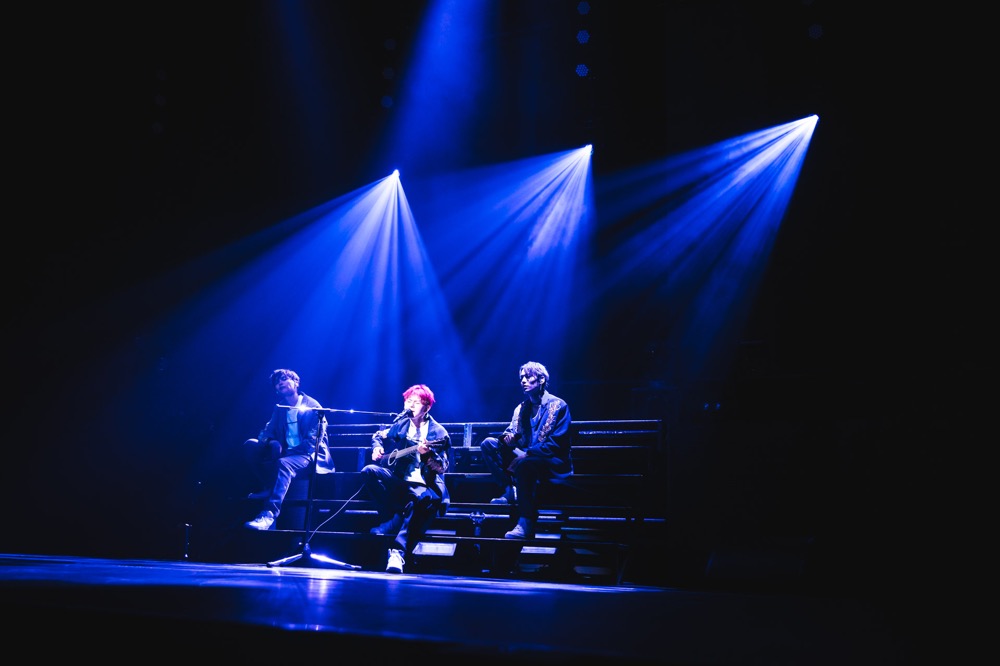 止まない手拍手に応えてのアンコールでは、なんと階段に腰かけてギターを弾き語るEIKUにTETTA、REIが加わって、昨年4月に発売された1stアルバム収録のバラード「Destiny」を待望の初披露。アコースティックな音色と待ち焦がれたボーカル3人の美しいハーモニーに、SWAGたちも息を詰めてステージを見つめ、TETTAは「緊張したね!」と漏らしつつ、「ファイナルにふさわしいアンコールになった」と満足げ。他の3人も「メチャメチャ良かった」「袖で聴いて感動した」と、仲間の奮闘を称えた。