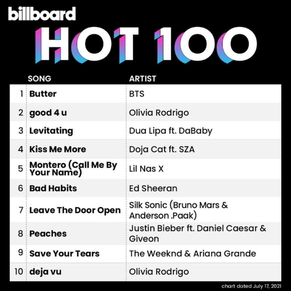 「Butter」はランクイン最初の週である6月5日付「HOT100」チャートで1位になり、最新チャートまで7週連続でトップを守り、ポピュラー音楽史にもうひとつの道しるべを立てた。これでBTSが「HOT100」で1位を獲得したのは通算12回目。韓国歌手としては初めて「HOT100」で1位を記録した「Dynamite」(3回)を皮切りに、フィーチャリングに参加した「Savage Love」のリミックスバージョン(1回)、アルバム『BE』のタイトル曲「Life Goes On」(1回)、そして「Butter」(7回)に至るまで、BTSは1年足らずで華やかな歴史の1ページを飾った。