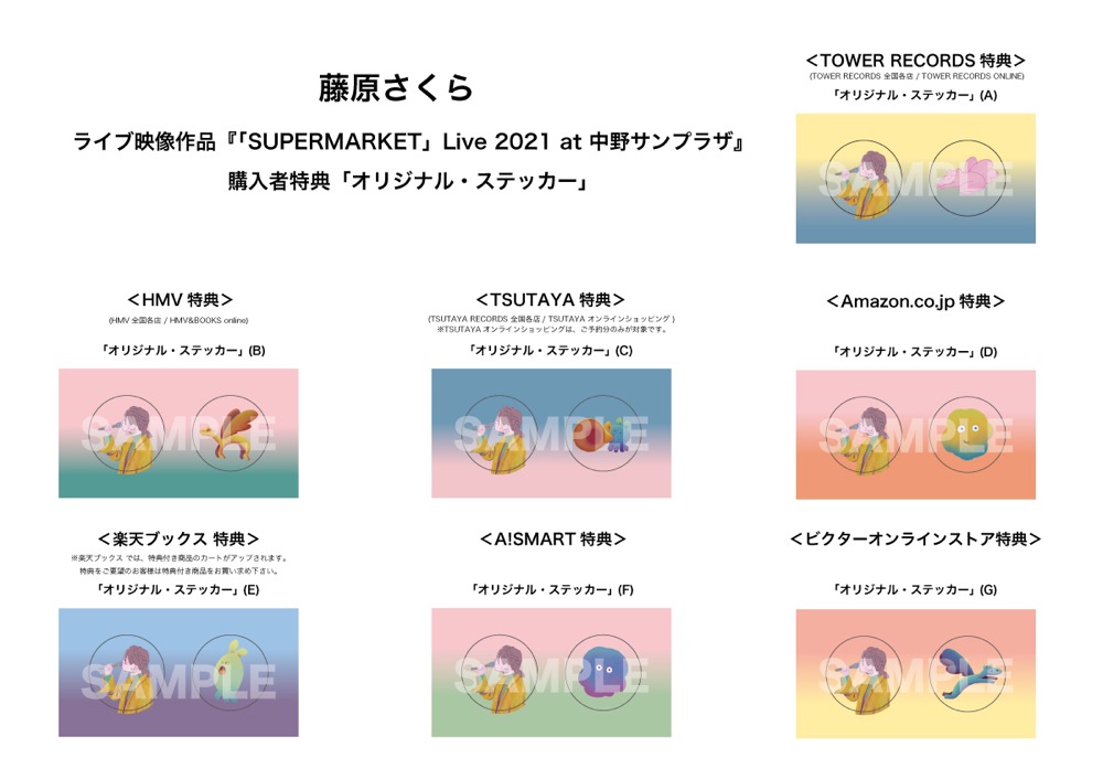 そして、ライブ映像作品『「SUPERMARKET」Live 2021 at 中野サンプラザ』の店舗別購入者特典オリジナルステッカーのデザインも本日発表。すでにYouTubeなどで公開されている『Kirakira(Oekaki Live Video)』内で登場している、ライブ当日のスタイリングがそのまま再現された藤原のロトスコープ、そして藤原が描いたイラストをモチーフに作成された、個性豊かでかわいらしいキャラクターたちがデザインされた、カラフルでポップなアイテムとなっている。オリジナル特典はなくなり次第終了となるので早めにチェックしよう。