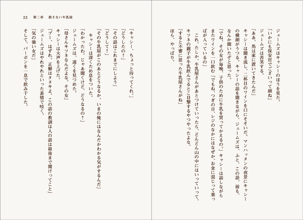 夏。プールサイドで海外ミステリーを読む園長。青空の下、静かにページをめくる。きらめくプール。この豊かな時間、誰にも邪魔させない。「ジェームズはキャシーの方を見た」。一行目から吸い寄せられる。傑作の予感。でも……キャシーって誰やったっけ? 園長の表情が一瞬曇る。あわてるな。こんなときのために、登場人物紹介があるじゃないか。「キャシー、弁護士の妻」OK、読書に戻ろう。「ジェームズはキャシーの方を見た」てか、そもそもジェームズって誰やっけ? あかん、ぜんぜん頭入ってけぇへん! 読書やめじゃ! 「プールサイドの読書はだいたいウソ」。やけくそみたいな決め打ちのセリフでCMを締める園長だった。
