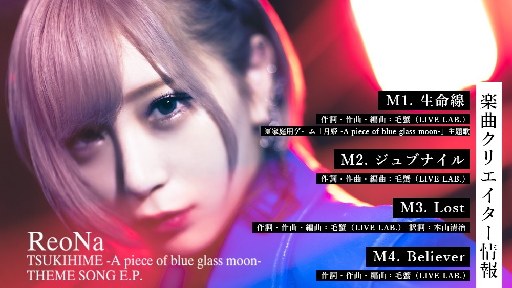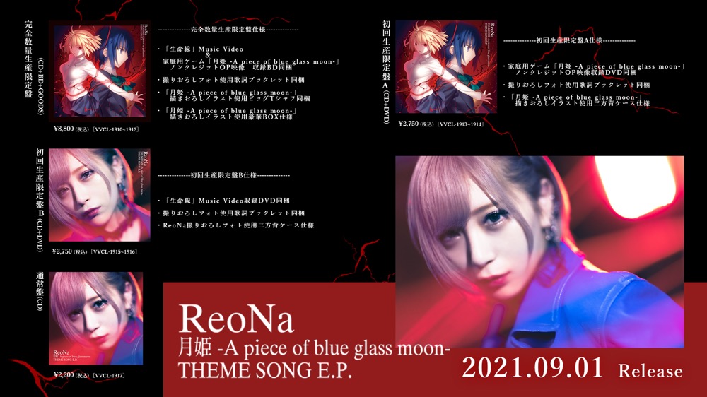 9月1日にリリースとなる『月姫 -A piece of blue glass moon- THEME SONG E.P.』は、描きおろしゲームイラストを使用したグッズを同梱した、豪華BOX仕様の完全数量生産限定盤、家庭用ゲーム「月姫 -A piece of blue glass moon-」ノンクレジット映像収録のDVDを同梱。描きおろしゲームイラストを使用した三方背ケース仕様の初回生産限定盤A、「生命線」のMVを収録したDVDを同梱し、ReoNaの撮りおろしビジュアルを使用したアーティスト盤の初回生産限定盤B、そして通常盤の4形態でリリースされる。「月姫“新生”」「伝説の復活」を長年待ち焦がれたファンにとってもReoNaファンにとっても、垂涎の1作のリリースとなる。