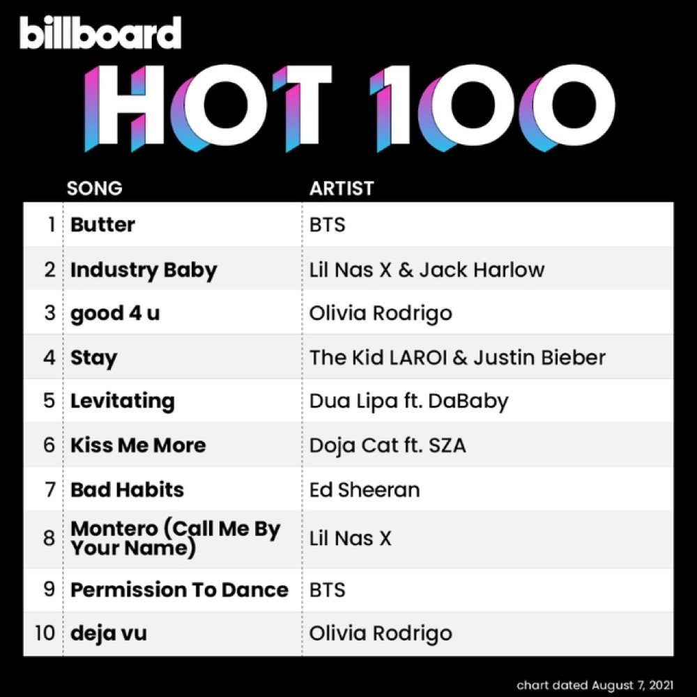 BTSは「Butter」で6月5日にチャート入りすると同時に「HOT100」で1位となり、7週連続トップを維持していたが、7月24日に新曲「Permission to Dance」で1位の“バトンタッチ”を記録。 先週(7月31日付)のチャートで、再び「Butter」が「HOT100」のトップに返り咲き、最新チャートまで連続して1位を獲得した。