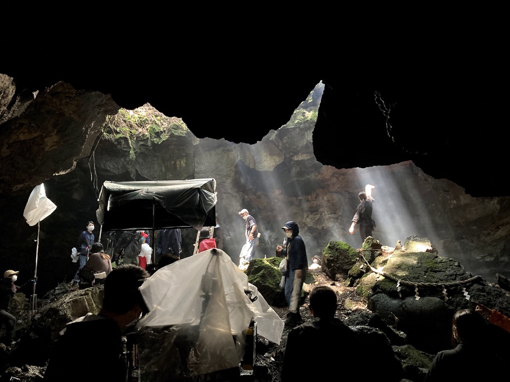 その前に昼食休憩をはさみ、佐々倉役の吉沢悠と老人役の久保酎吉も合流し、撮影が再開されたのは15時前。日没までの時間も迫る中、ピリピリするスタッフが出てきてもおかしくない頃だが(笑)、大自然の癒しのおかげか、元々このチームが持つ良い雰囲気のおかげか、現場には笑いが絶えない。最後のシーンは、洞窟から出て来た尚哉が、高槻を地面に下ろしていると、そこに佐々倉と老人が現れる、という場面だ。