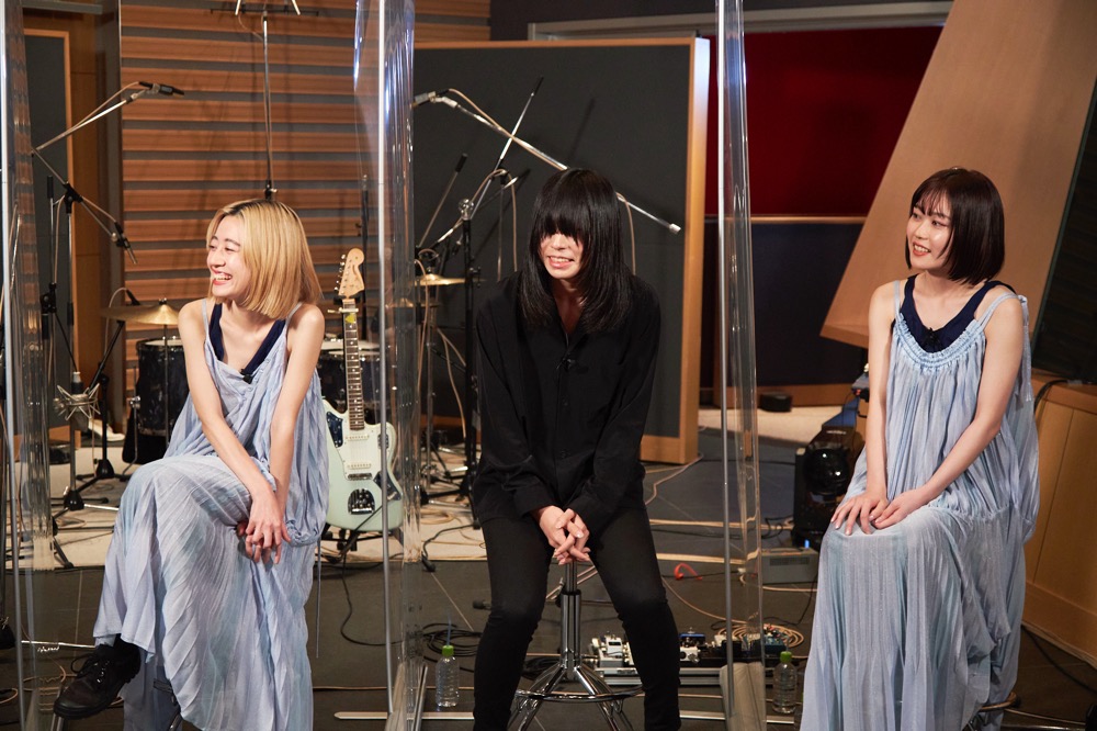 続いて、羊文学に、映画のために書き下ろされた「マヨイガ」の制作過程に込められた思い、という質問が。制作担当の塩塚は「何回も脚本を読んで、私が最初に原型を作る。そこからふたりと話しあってアレンジしていきましたね」とコメント。そんな塩塚が作ったデモを聴いて、フクダは「映画に通じる、優しさ、おかえり、大丈夫だよといった母親みたいなものを自分なりに解釈してドラムを叩くようにしました」と話した。