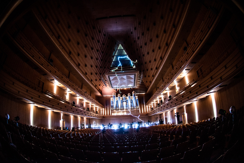 事前プログラムの最後にメジャー2ndアルバム『Editorial』のリード曲「アポトーシス」のMVが放送されると、東京オペラシティのコンサートホールのステージにヒゲダンメンバーとサポートメンバーが登場し、1曲目の「I LOVE…」からオンラインライブ本編がスタート。クラシック用のコンサートホールで幻想的なライティングと共に壮大な演奏を響かせた。