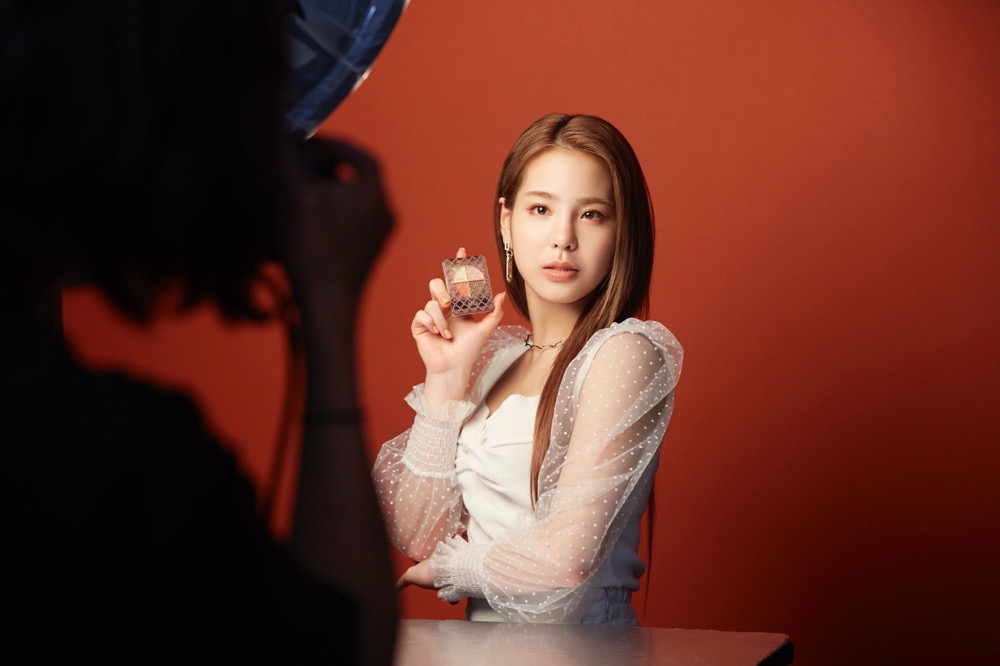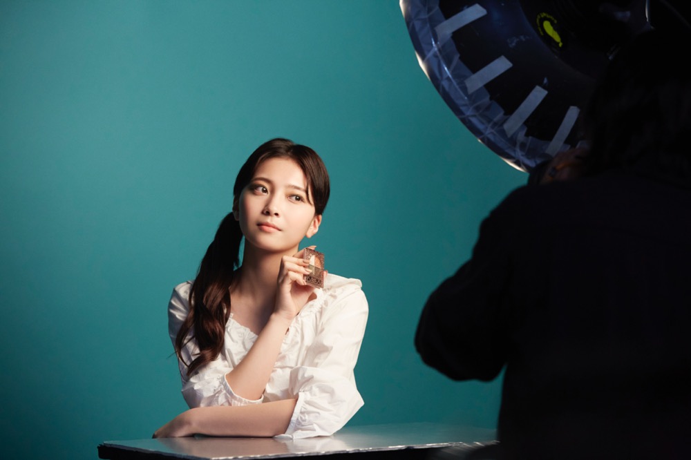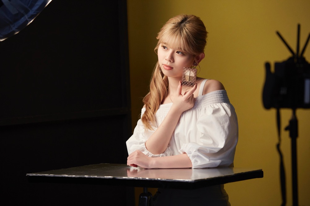 普段は穏やかな雰囲気のAYAKA。カメラの前に立つと、透き通った肌にのせられたブラウンレッドのアイカラーが目もとを際立たせ、芯の強さを感じさせる凛とした美しさで周囲を驚かせる。一方で、商品の持ち方が心配なのか念入りに確認する一面も。撮影が終わりホッとした時に見せた笑顔とのギャップにスタッフも癒されていた。