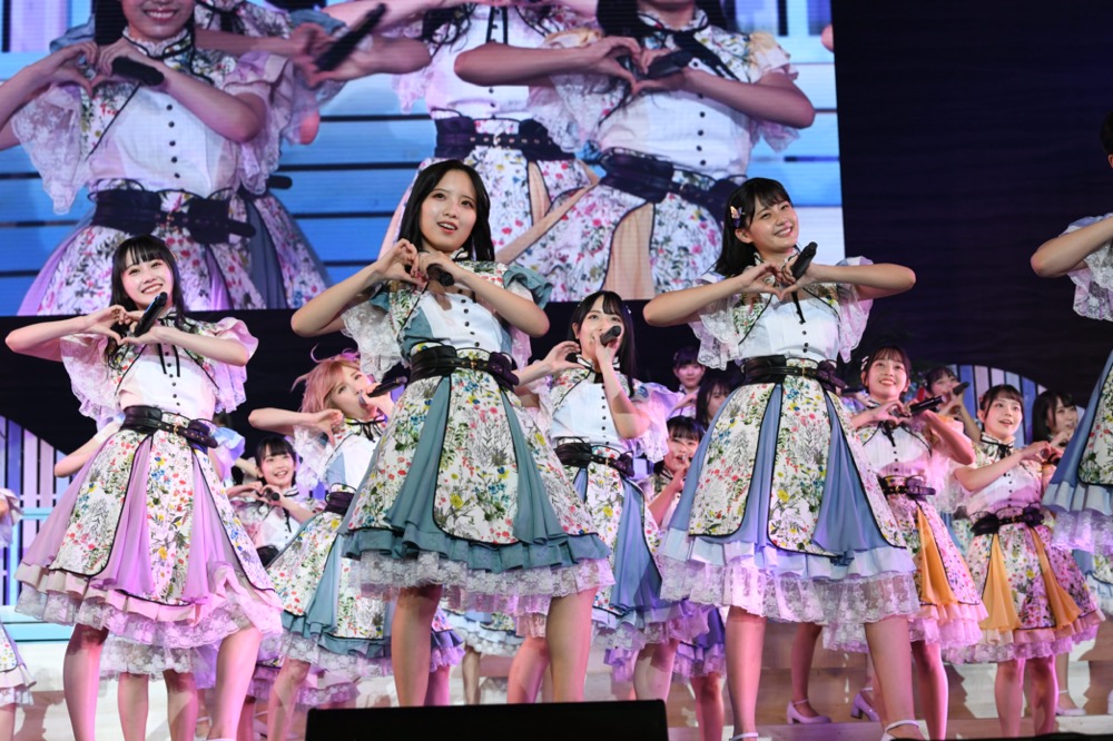 アンコールが始まると夏らしく全員浴⾐でうちわを持って登場。観客の⼿拍⼦に合わせカウントすると、デジタル花⽕がモニターに映し出され、「僕の打ち上げ花⽕」を元気いっぱいにパフォーマンス。観客のテンションも⾼まるなか、ラスト曲「夢⼒」を披露。キャプテンの今村から締めの挨拶があり、幕を閉じるかと思わせると映像が流れ7thシングルに関する発表に……。初選抜に選ばれた⼩島愛⼦は「現状に満⾜せずに頑張っていきます」と涙ながらにコメントした。