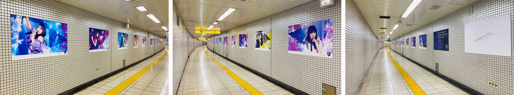 乃木坂駅構内に、全長約150メートルにわたって合計45枚の大型広告が掲出。