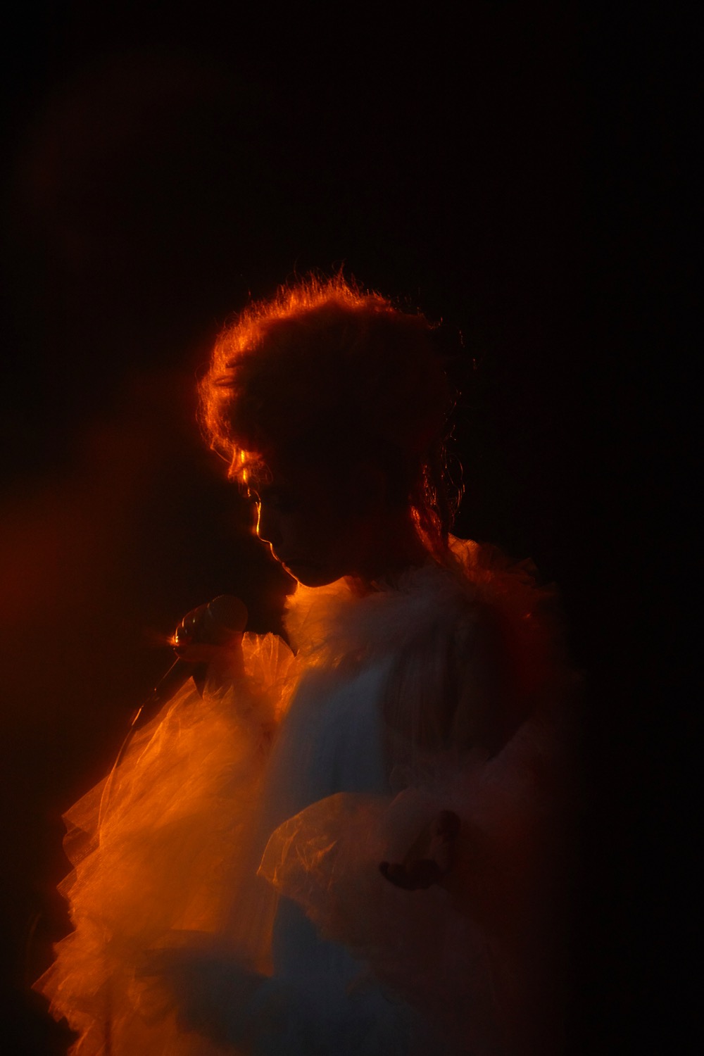 そして紗幕が左右に開かれる。ステップがつけられた真っ白なセンターステージを挟み、舞台上手(右)前方にはリズム隊、上段ステージにはコーラス隊。下手(左)前方にギター、キーボードにホーン、上段にはストリングス。各ブースにはメンバー3人ずつが配され、コスチュームは全員がホワイト。そこへ30年の重みを表すようなボリュームのオーガンジーを贅沢にあしらった純白のドレスに、シルバーのラメがあしらわれたブーツでCharaが上段ステージから静かに降りてくる。舞台の四方角に3人ずつで陣取るミュージシャン、舞台装置にCharaの衣装。すべてが「白」に統一された舞台は目にも鮮やかで、30周年を迎えて真っ白な原点に向かう決意の表れでもあるようだ。