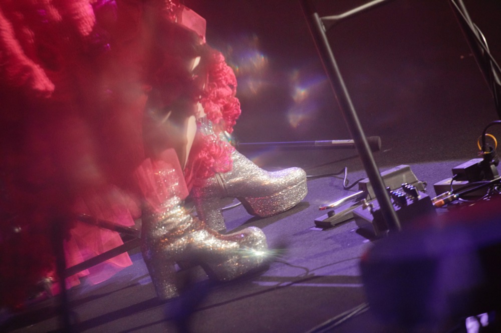ライブの前半は30年のキャリアを振り返り、Charaにとって思いが深い楽曲を中心に構成。ここまで演奏された静かなトーンの楽曲群は「恋をした」から、ディスコ調のアップビートサウンドに一転。それまでマイクの前を離れなかったCharaも、ハンドマイクでゆらゆらと身体を揺らしながら、ステージの左右に動く。オーディエンスも席を立ってクラッピングで応じる。「70%-夕暮れのうた」では徐々にアグレッシブなロックテイストを帯びてきて会場も俄然盛り上がる。YEN TOWN BANDの「Swallowtail Butterfly ~あいのうた~」のイントロが奏でられるや場内も騒然。この曲がリリースされて今年で25年。儚くも懐かしげな演奏に場内もじっくりと聴き入る。この曲が終わるとCharaはステージを降りる。ここで前半パートは終了。