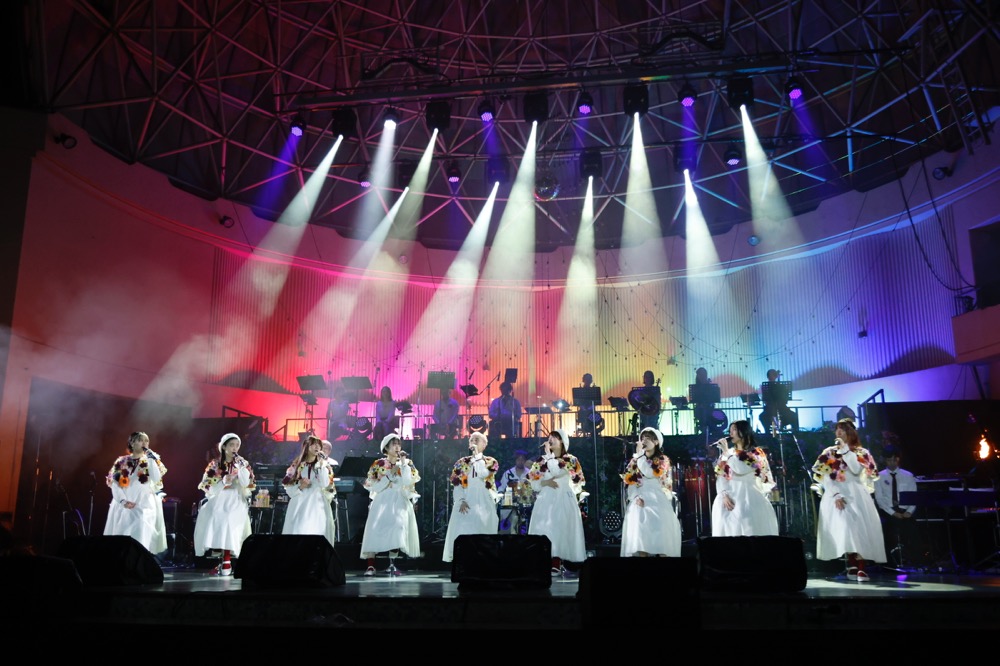そして一気に後半のパートは「青い青い星の名前」からバンドメンバー紹介を通して、ひさしぶりの「中人DANCE MUSIC」そして「リアル鈴虫の中で歌えるね。」という安本彩花のMCをはさんで9人で歌う「なないろ THE FIRST TAKE ver.」「約束」「蛍の光(ちゅうおんver.)」と続け、ラストは明るく「イヤフォン・ライオット」で約2時間のライブを締めくくった。