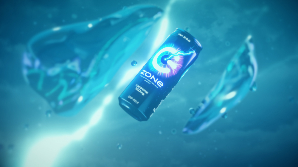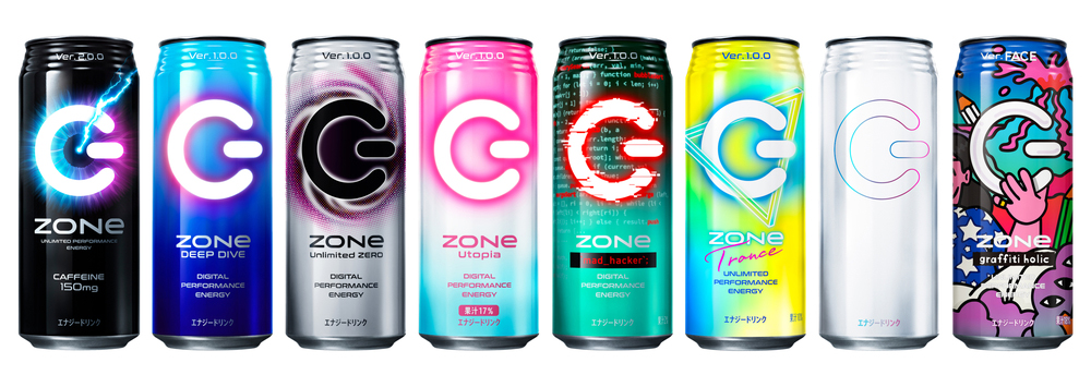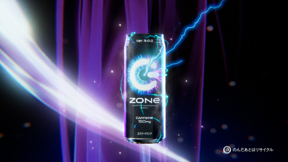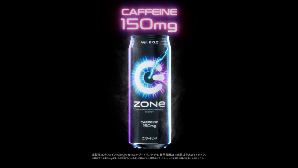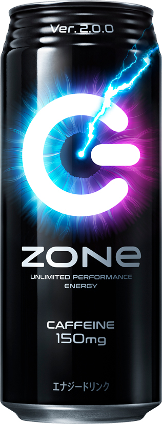 “ZONe”は、飲む者を無敵のゾーンへと導くエナジードリンク。2021年6月に、“ZONe”歴代最強カフェイン量となる150mミリグラムに増量、パッケージも、無敵のゾーンに入った目=「ZONe EYE」を表現したデザインに一新され、「ZONe Ver.2.0.0」としてアップデートされた。