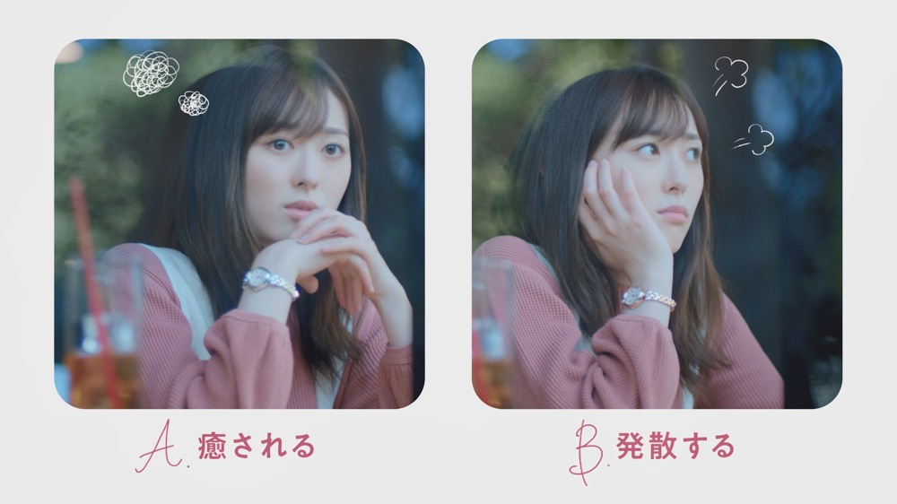 福原遥が様々なシチュエーションで、何かをきっかけに心動かされる瞬間を演じ、恋人のふとした行動にときめく様子や、何気ないひと言に元気をもらう様子、モヤモヤしたときにペットの犬に癒してもらう様子、涙を流すことで気持ちが晴れやかになる様子を描く。