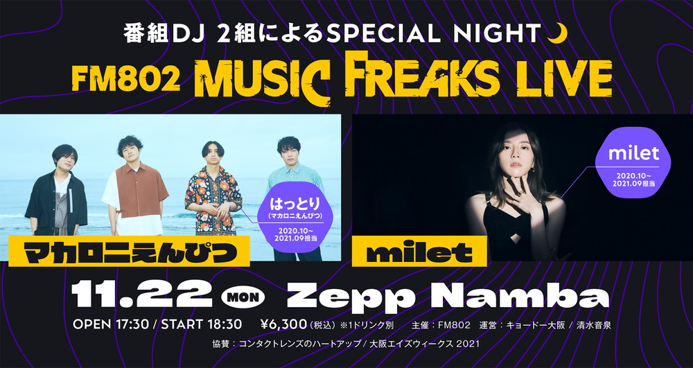 2020年10月~2021年9月の1年間、隔週でFM802の日曜日の番組『MUSIC FREAKS』のDJを務めたはっとり(マカロニえんぴつ)とmiletが、11月22日にZeppNambaにて番組名をタイトルにしたライブイベント『MUSIC FREAKS LIVE』で共演する。