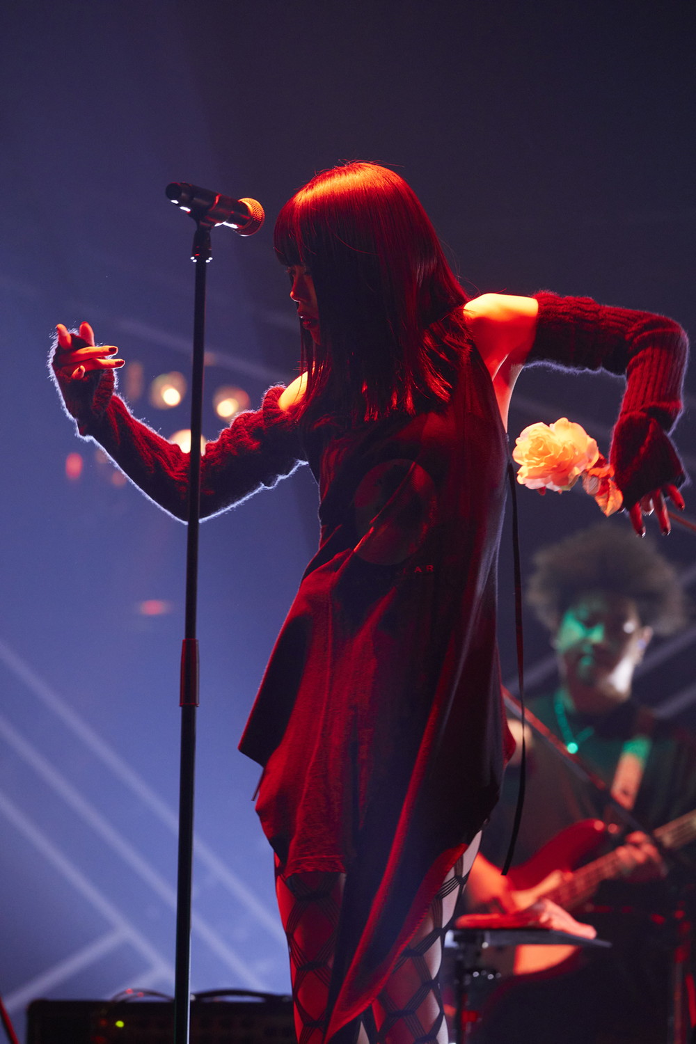 2番手はBiSHのメンバーでもあるアイナ・ジ・エンド。黒い衣装に身を包み左手に白い薔薇を一輪もってステージに表れ、ふたりのダンサーと共にキレのあるダンスを披露し客席を魅了。後半は自身の歌声をじっくり聴かせるステージを展開。