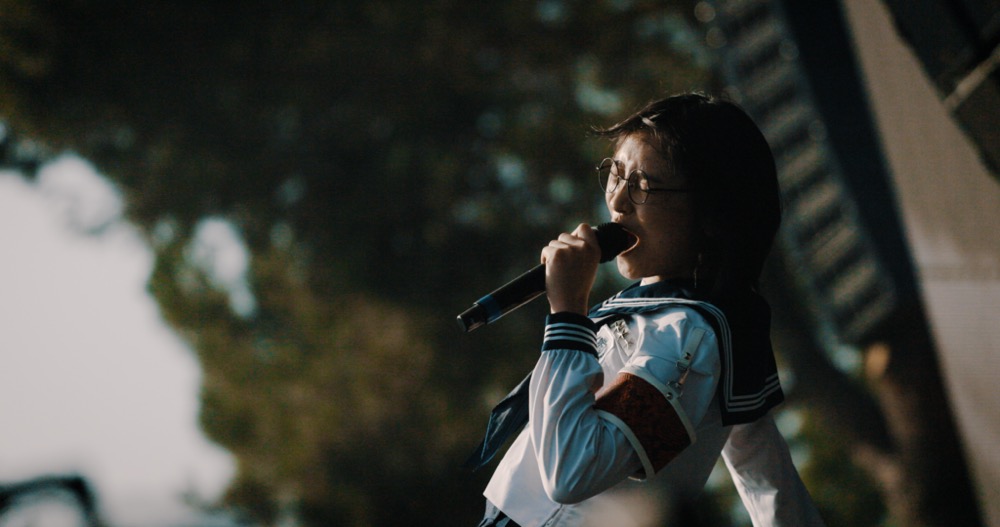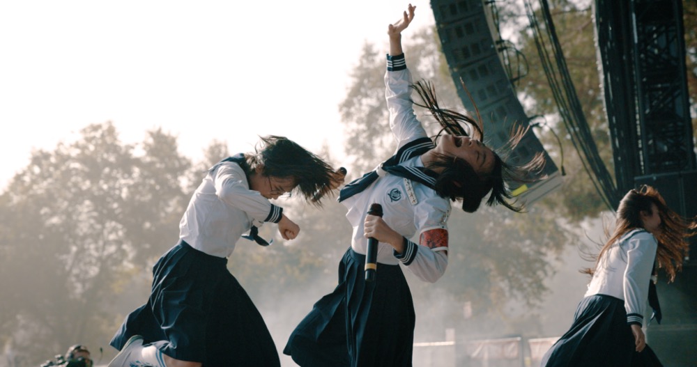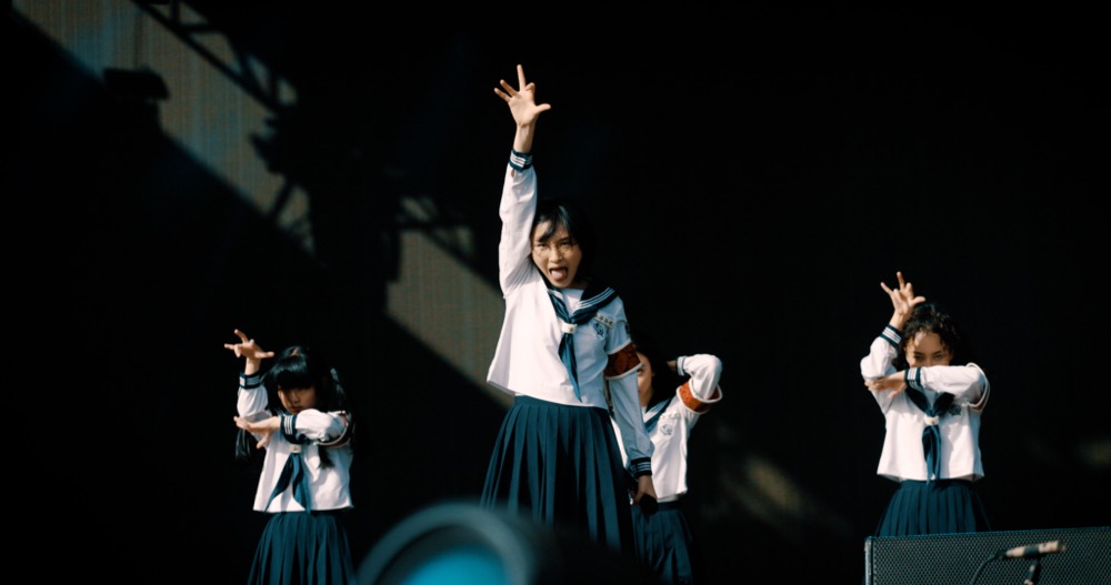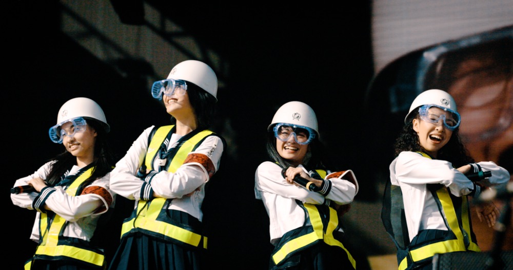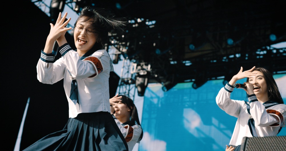 一曲目が終わったあとのMCでは英語での自己紹介もあり、SUZUKAが英語で「Say、めちゃめちゃ気持ちいい〜!」と呼びかけると、観客もそれにしっかりと「MECHA MECHA KIMOCHII〜!」と応えた。そして、「Let’s Go Head in The Clouds!」と叫ぶと2曲目の「試験前夜」が始まり、赤いハチマキを使ったパフォーマンスが彼女たちの歌と踊りをより際立たせて見せた。続けて、「恋ゲバ」でもダイナミックなダンスと演出が全力で感じられ、会場を圧倒した。