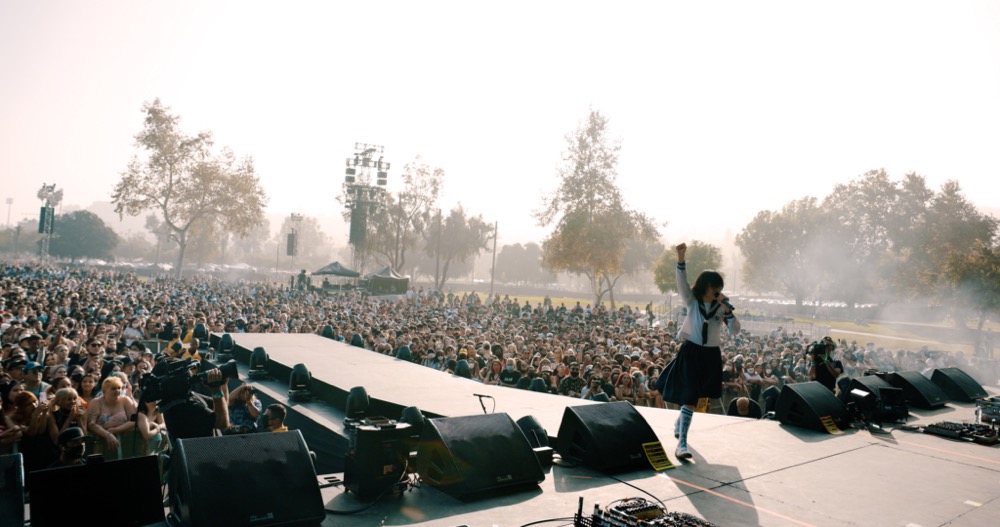 メンバーが登場してさっそく、ロサンゼルスの観客に大和魂を見せつけるような人間太鼓でステージが始まり、「最終人類」のパフォーマンスがスタートした。組体操のような振り付けが盛り込まれた激しいダンスで、初めての海外フェスに対する気合いが十分感じられた。