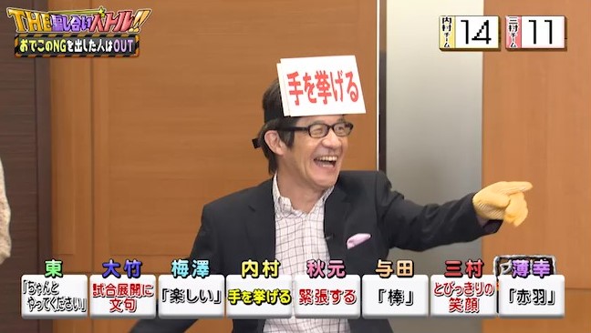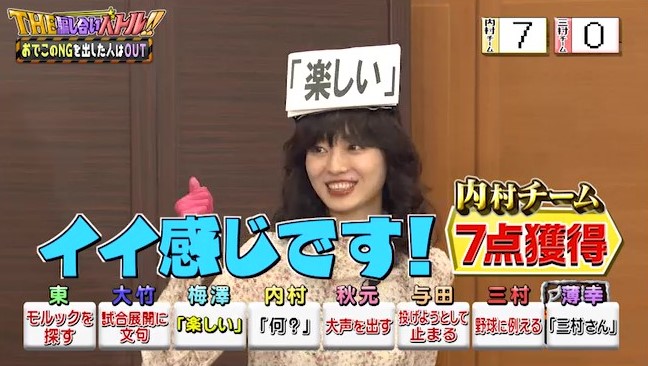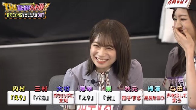 キャプテン秋元を見かねた与田は、お見合いコントでギャルに扮して、ボケる・三村マサカズを見つめる・拗ねるなど演技派の一面を披露して大奮闘。続いて、母親役に扮した梅澤の活躍も期待されるなか、「旦那の悪口を言う」というNG行動に誘導されてしまう。最初は「こんな大きな場で(悪口なんて)…」(梅澤)と困惑した様子だったが、ようやく「靴下を裏返すんですよね。それが唯一嫌なところかな。」(梅澤)と絞り出し、かわいらしい悪口に一同ほっこりとするひと幕も。大竹一樹も思わず「許してあげてほしい」と呟き、梅澤の優しい一面が垣間見られた。