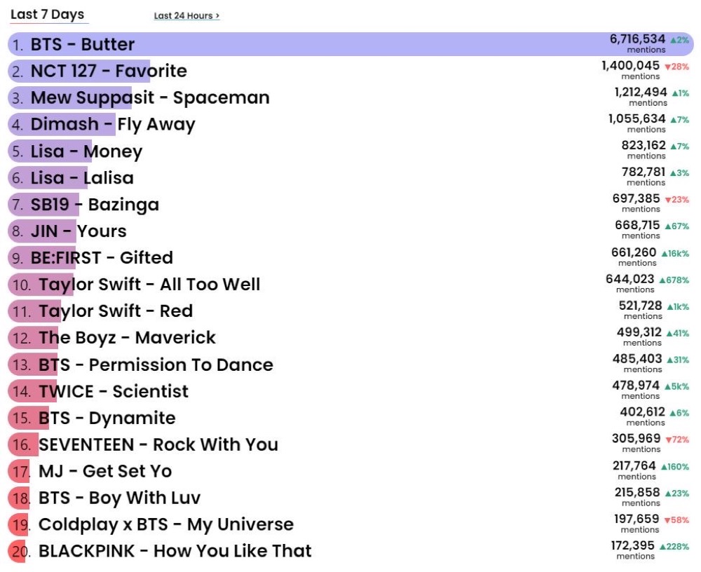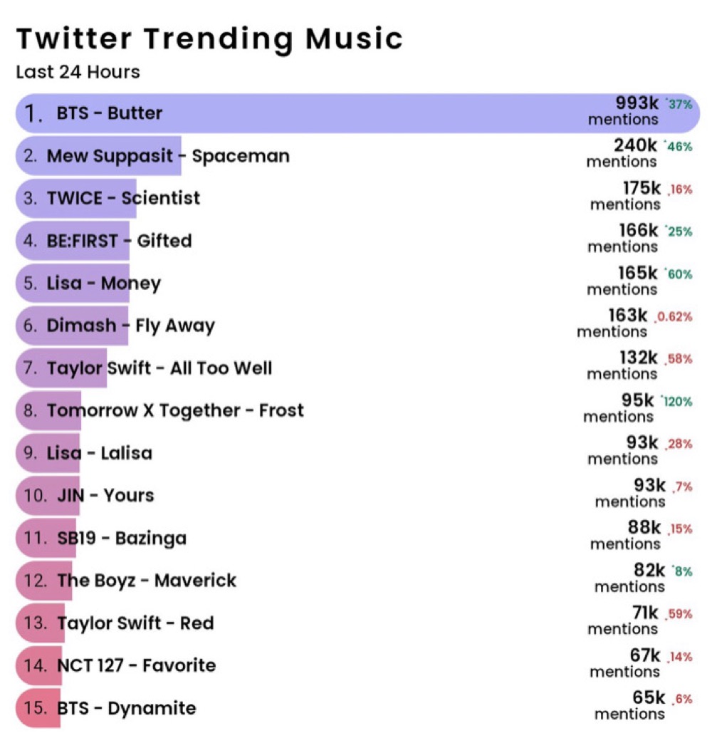 “Hot Trending Songs”チャートはTwitterが提供し、Remy Martinが後援する米ビルボードが10月22日に初公開したあらたなチャート。Twitterにおける音楽関連の世界的なトレンドや会話をリアルタイムで追跡しており、過去24時間と過去7日間のデータを見ることができる。毎週金曜日から木曜日までの活動を対象としており、米ビルボードの他のウィークリーチャートと並行して掲載される。