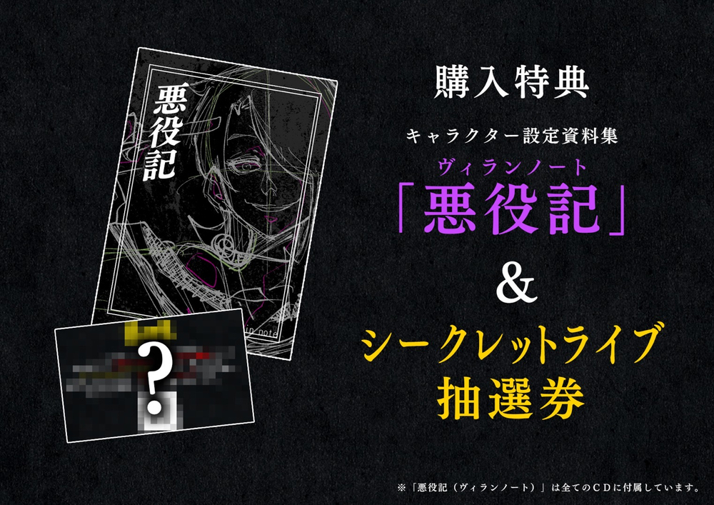 CDには 本人が今まで描いてきた人気キャラクターたちの解説ブック『ヴィランノート』、主催有観客ライブの無料招待券が付属。ファンは要チェックだ。