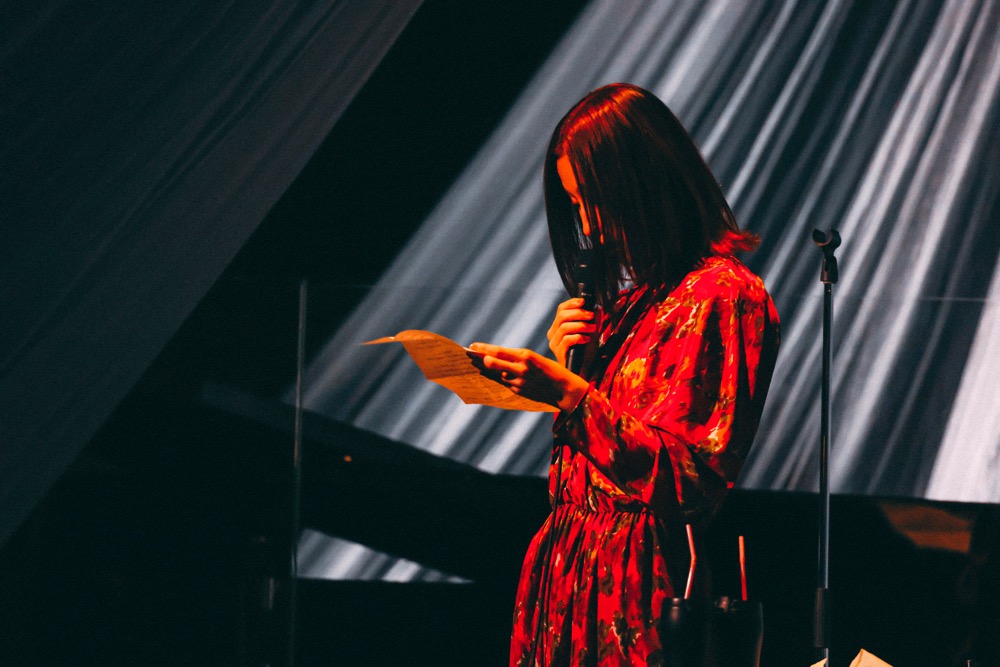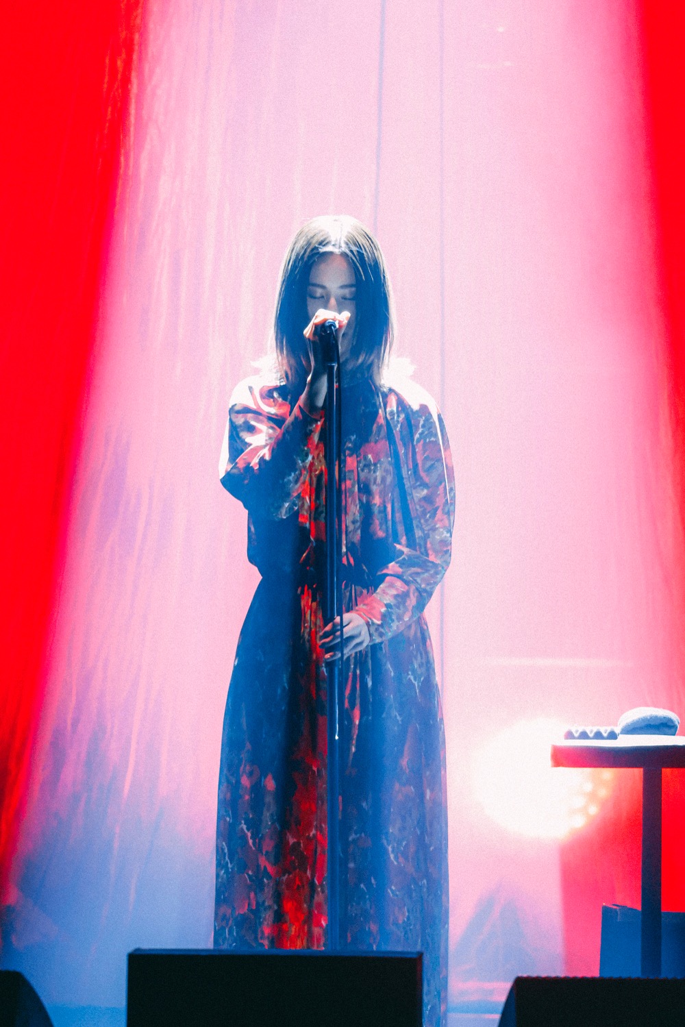 続いて、楽曲から生み出された物語の朗読が静かに始まり、言葉を大切にする彼女の人柄とワードセンスに耳を傾けているとそのまま「無機質」へと連なっていく。音源以上の表現を体験するステージならではの演出に、会場はいっそう身を委ねていく。