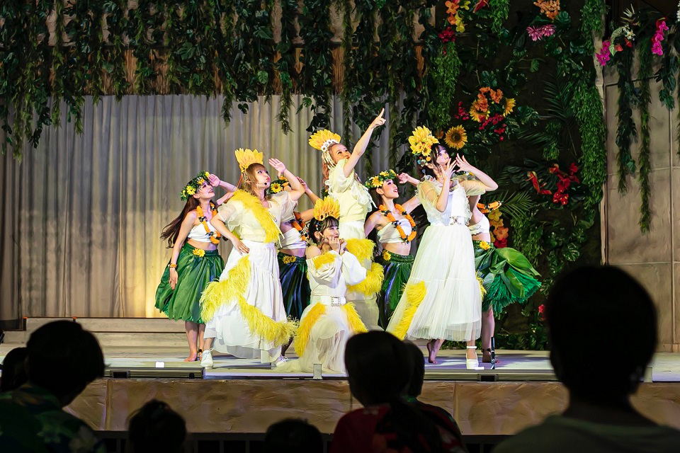 練習ではお互いに意見を出し合いながら、直前まで入念なリハーサルを実施。そしていよいよ迎えた本番では、実際にスパリゾートハワイアンズに遊びに来ていた観客の前で、1回きりのステージを披露。14人で作り上げた迫力あるパフォーマンスに、会場は大いに盛り上がり多幸感に包まれた。本番が終わり舞台裏に戻ると、メンバーの目には涙が溢れていた。