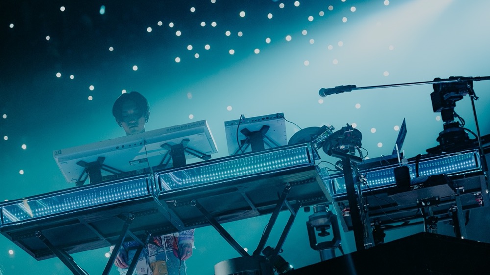 1曲目はikuraのアカペラが響きわたる「あの夢をなぞって」からスタート。ステージの床面はなんと合計1,682枚のLEDパネルとなっており、楽曲のモチーフでもある花火がこれでもかと飛び交うド派手な演出に、この日に向けて長期間準備をしてきたYOASOBIの力の入れようが感じられる。続く「大正浪漫」でもミュージックビデオに見られる煌びやかなグラフィックが展開し、時を超えたピュアなラブストーリーの世界に観客を誘う。「ハルジオン」では一転してアーバンな演出で、切なさを振り切って進む主人公の意思をも感じるパフォーマンスを見せた。