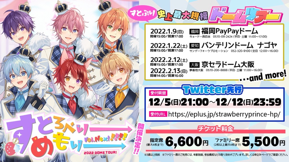 すとぷり史上最大規模のドームツアー『すとろべりーめもりー Vol.Next!!!!』のTwitter先行チケット受付が、12月5日21時よりスタート。Twitter先行受付期間は12月12日23時59分まで。