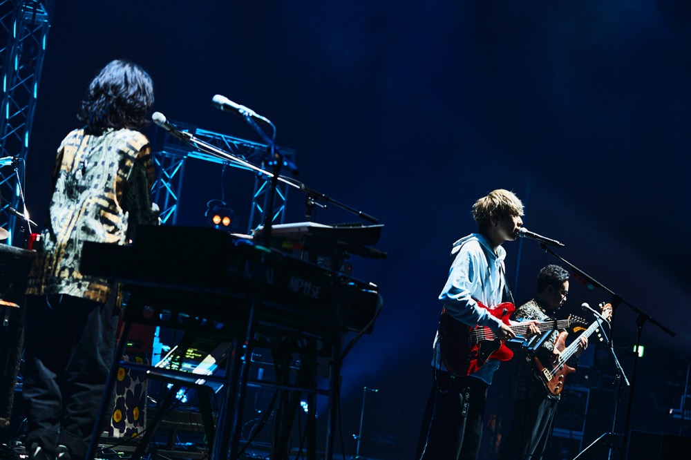 「『大停電の夜に』はindigo la Endに休日課長がいた頃に作った曲で、昔は変拍子がはみ出しちゃったりしたけど、きれいに終われるようになった」と笑って話し、両バンドの関係性が垣間見えると、続いて「夏夜のマジック」を披露。この曲もすっかりライブの定番曲となって、サビではフロアから一斉に手が上がり、アウトロで川谷が栄太郎を煽りまくるのも、お馴染みの光景となった。さらには、ライブ当日に配信がスタートした新曲「邦画」を初披露。“泣いたり笑ったり”というコーラスが耳に残るミディアムチューンで、思い思いに体を揺らすオーディエンスの姿が見て取れた。