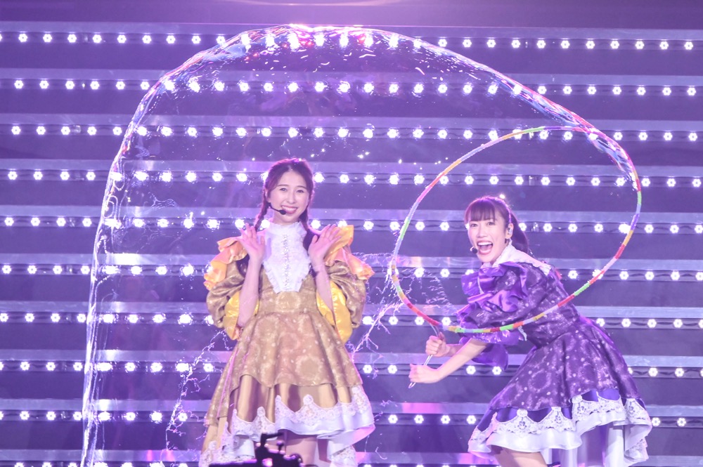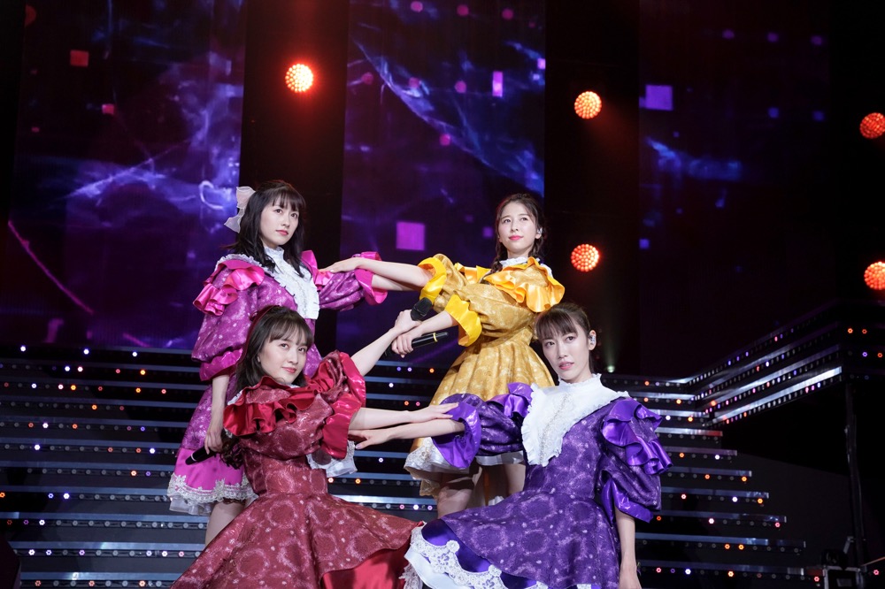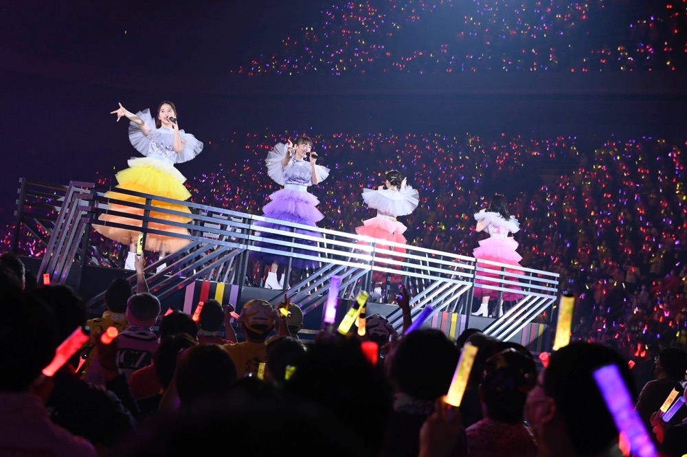 それぞれがトロッコに乗り込み、4色に染まったサイリウムで溢れる客席へと繰り出す。アッパーなダンスナンバー「Chai Maxx」を披露し、久しぶりのダンス合戦を楽しんだ。その後は約3年ぶりの歌唱となる「全力少女」を披露し、ラストは勢いのある「仮想ディストピア」でモノノフのテンションを大いに盛り上げ、一度ステージをあとにした。