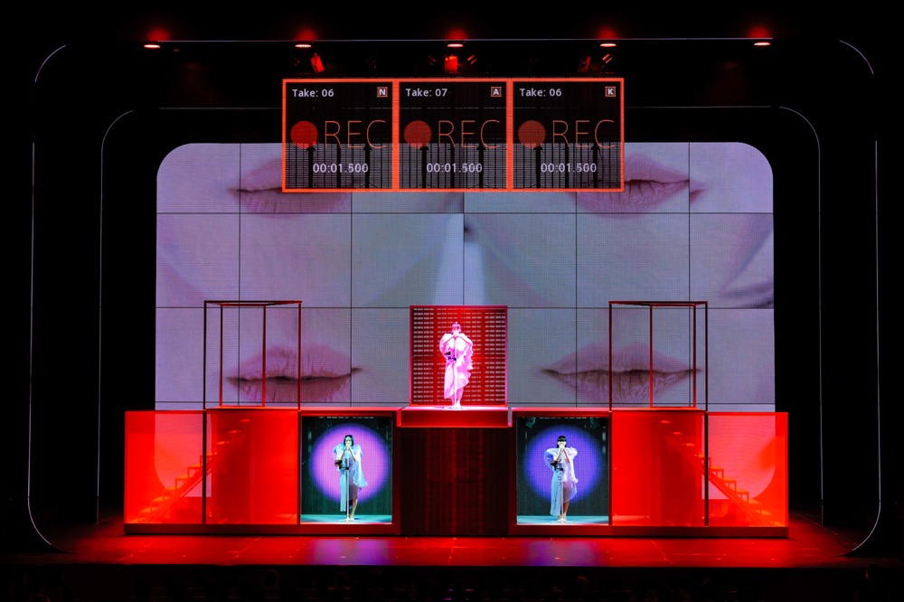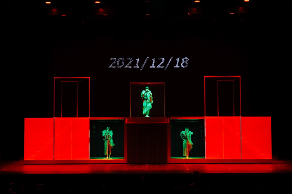 次に2019年の公演時にも話題になった「Record」。ステージとリフター上と別々の三ヵ所に立つメンバーが、マイクスタンドに向かい、頭上の「REC」ボタンが点いた順にそれぞれ生声で発した言葉や音をサンプリングしてビートにし、リアルタイムで重ねていくという演目だ。