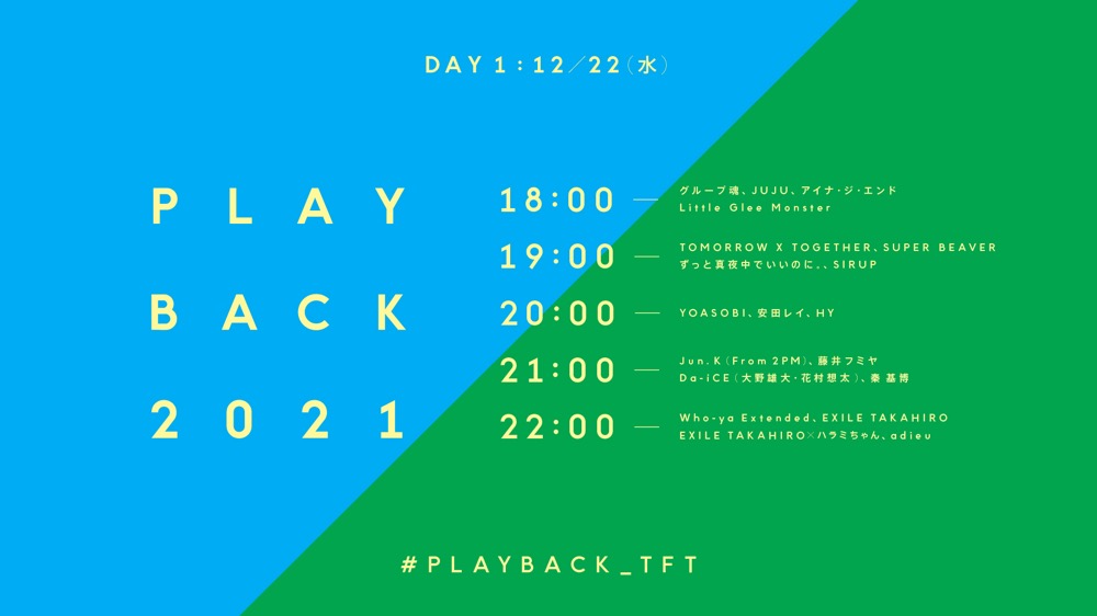 出演:グループ魂、JUJU、アイナ・ジ・エンド、Little Glee Monster、TOMORROW X TOGETHER、SUPER BEAVER、ずっと真夜中でいいのに。、SIRUP、YOASOBI、安田レイ、HY、Jun. K (From 2PM)、藤井フミヤ、Da-iCE (大野雄大・花村想太)、秦 基博、Who-ya Extended、EXILE TAKAHIRO、EXILE TAKAHIRO×ハラミちゃん、adieu