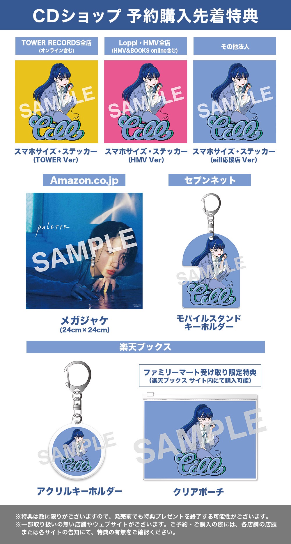 特典絵柄のデザインには、「プラスティック・ラブ」のリリックビデオも担当したレトロで可愛いイラストが若い世代から支持を集めているイラストレーター・佐藤なつみを起用。マイクスタンドを片手に赤いリップとポニーテールが印象的なeillがキュートなイラストで描かれている。これらの特典は全国のCDショップにて、『PALETTE』の予約・購入者を対象に先着でプレゼントされる。各店舗でご用意している特典数量には限りあるので、予約はお早めに。