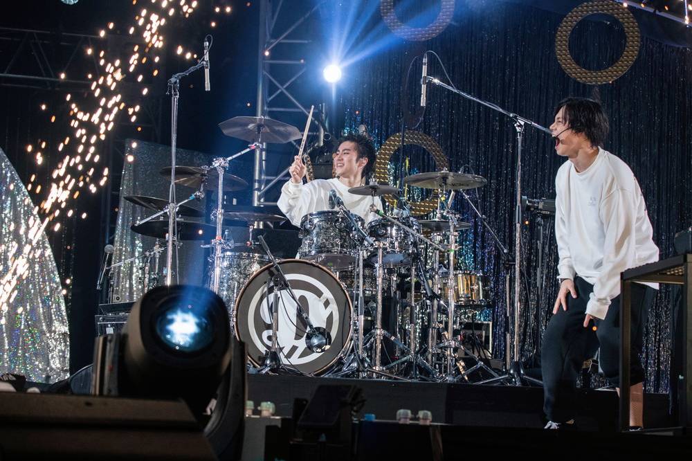 20分の転換ののちに再びターンテーブルが回り、今度はバンドセットが現れると、泉大智(Dr)の力強いカウントから「星をつかむ者達へ」で後攻のDISH//パートがスタート。北村匠海(Vo/Gu)と橘(DJ/Key)が勢いよくラップを掛け合い、矢部昌暉(Cho/Gu)と泉が声を合わせるというメンバー全員で挑む姿勢は勇ましく、スタンドに立てたギターをかき鳴らす北村を含め、プレイの激しさも見所だ。