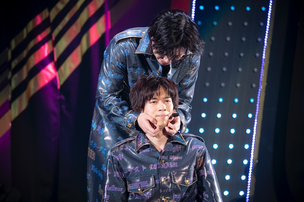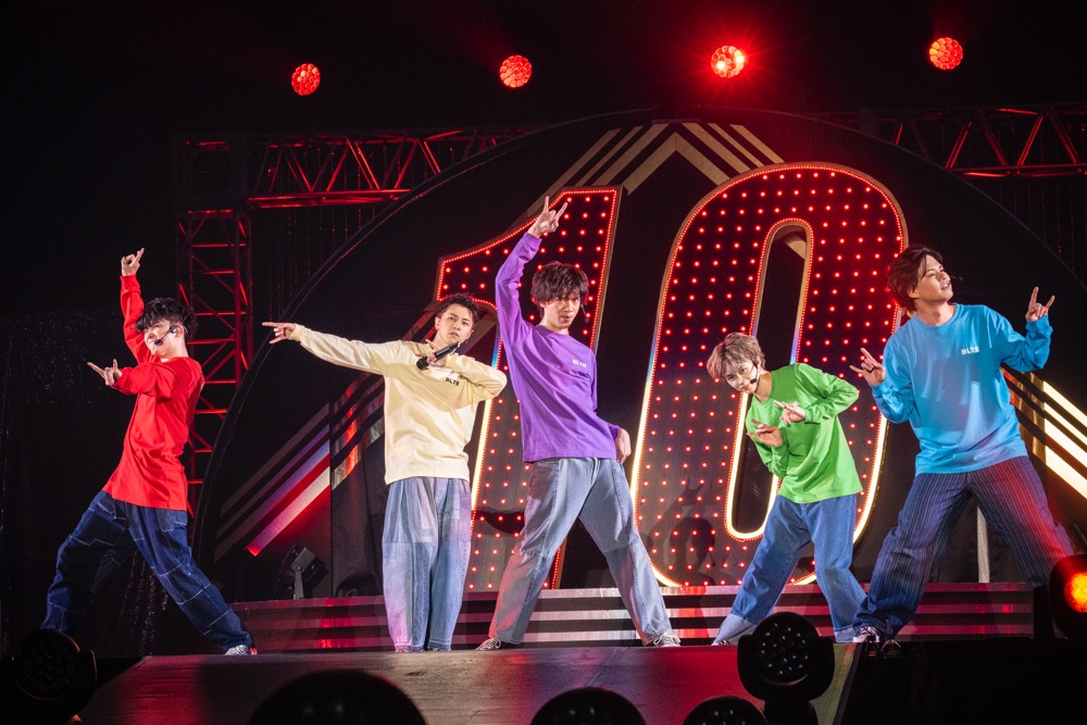 そして飛び交うレーザー光線の立ち込めるスモークのなか、近未来感を醸す「Time Wave」に、ユーキの豪快なアクロバットから火花がスパークする「Time of GOLD」を連ねたタフなダンスリミックスで“時”を巻き戻すと、天空から白の世界へと着地する5人の映像が。LEDモニターの中で、これまでリリースしてきた作品が踊る5人の頭上に回り、そのタイトルが5人に吸収されるという劇的な流れで、いよいよ歴代の全CDシングル曲を並べたノンストップメドレーがスタートする。「俺たちの10年間の想い、すべてココでぶつけてやる」とユーキが告げて、5色に輝く巨大な“10”の字を背に始まったのは、もちろん1stシングルの「TRAIN」。そこからタクヤがラップを入れる「Shake body」に、カイがパトランプ付きのヘルメットを装着して敬礼する「POLICEMEN」、スモークの中からマント姿で這い出たリョウガが“ずっと君だけを”のキメ台詞と共に口元を血で汚す「Bloody Night」と、各曲のセンターメンバーもしっかりフィーチャーしてゆく。ファンタジックな「Starlight」に、ユーキが軽やかにバク転を決めた「Kiss Me Baby」、「ikki!!!!!i!!」では花道に飛び出したメンバーがメンバーカラーの扇子を振って、「Believe×Believe」で全員が白目を剥くという急展開は、まさにジェットコースターのごとし。だが、これでもまだまだ序の口だ。