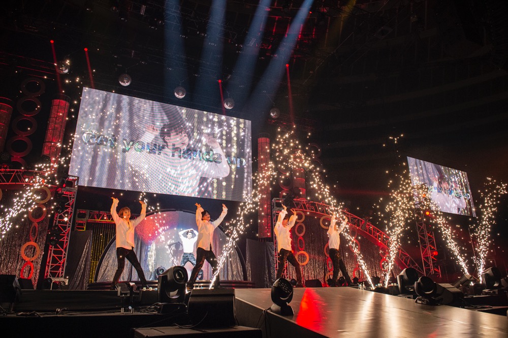 メンバー写真が10年前から現在へとメタモルフォーゼして微笑むオープニング映像が流れると、メンバーカラーの5色に光り輝く巨大ミラーボールがオープンして5人が登場。アメリカをテーマにした王道ディスコチューン曲「Dance Dance Dancing!」で、11年目のスタートを晴れやかに、華やかに飾る。タイトルそのままに“踊る”喜びを身体中で表現するかのような曲の後半には、29人のキッズダンサーがステージに飛び出してくるスペシャルな演出も。そして「『DANCE DANCE DANCE』始まりました。楽しんでいきましょう!」というカイの言葉から始まった「Magnifique」が、爽快な疾走感で曲のモチーフになっているニューカレドニアの美しい風景を脳裏に浮かばせる。大きなステージに端から端までズラリ並んで踊るキッズをバックに、5人はアリーナ客席に突き出た花道を笑顔で進んで、ボーカルのタカシは“もっと誇ってジブンを”“you are so beautiful”と高らかに歌唱。“DANCE”というライブコンセプトに加え、そこに込められた“自分を愛してほしい”という最重要メッセージを集まった8号車、さらには世界に向けて叩きつけるというオープニングに、観ているこちらは序盤10分でノックダウン寸前だ。
