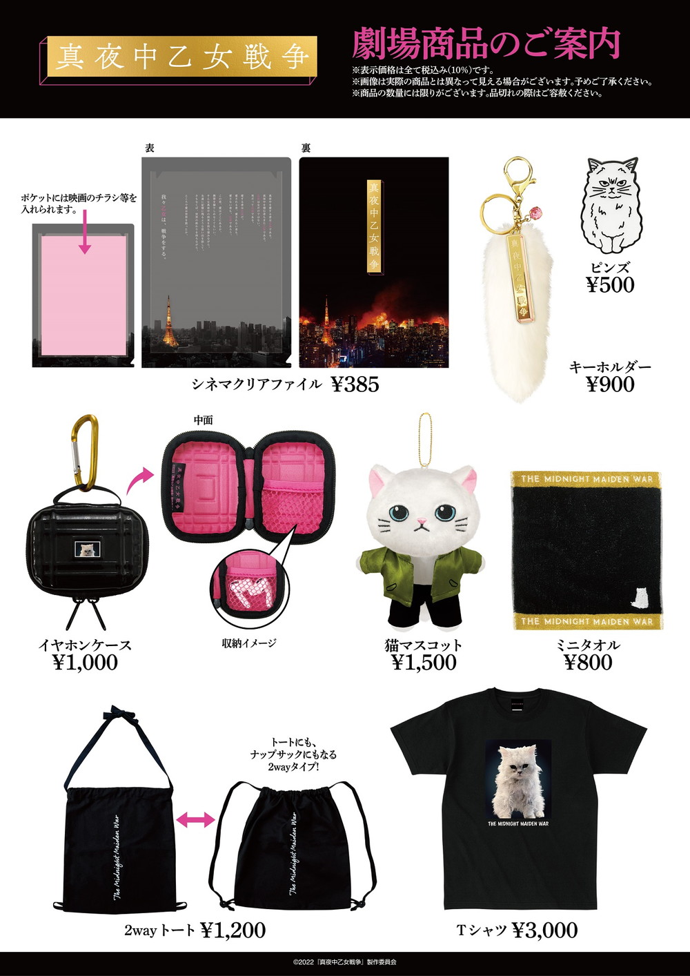 さらに各種劇場グッズの発売も決定。定番のクリアファイルやキーホルダーから、イラストレーターWALNUTコラボの猫のピンズ、イヤホンケース、ナップザックにも肩がけにもなる2wayトート、ミニタオルなどシンプルでデイリーユースしやすいアイテムが揃う。グッズは、1月21日より全国の上映劇場と「現代オンラインショップ」にて販売開始予定。詳細は、映画『真夜中乙女戦争』公式サイトをチェックしよう。