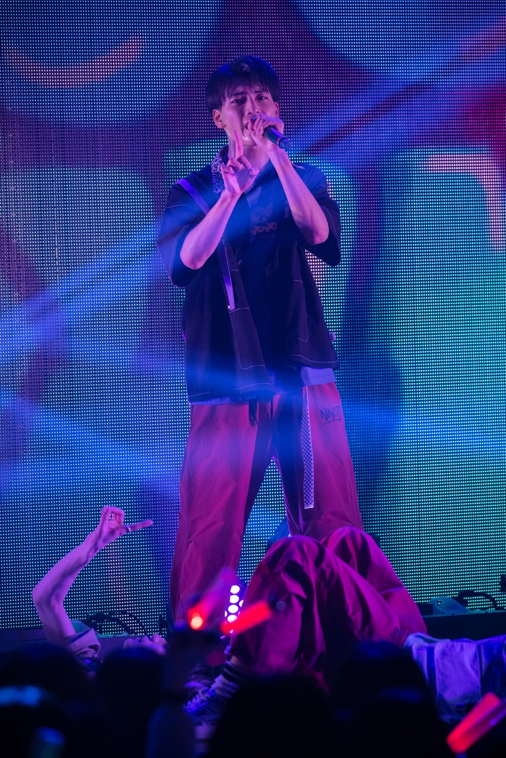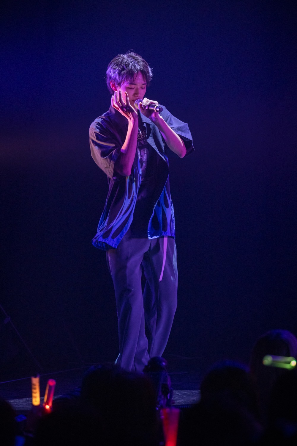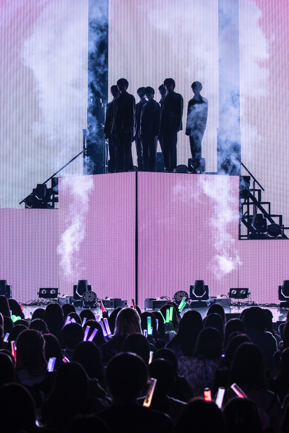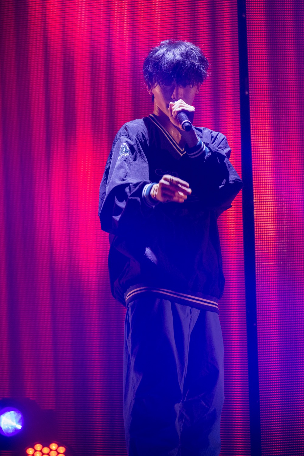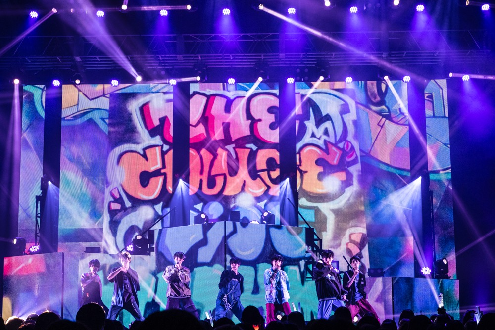 間髪入れずに「柘榴」から、モニター上でミラーボールが回る「In the Nude」を挟み、「半分相逢傘」では“男女の一夜の駆け引き”という、平均年齢17.8歳のグループには過酷なテーマに挑戦。確かに間奏では小泉と女性の会話が流れたり、吉澤が低音イケボで“これでどっちも悪いね”と囁いて“悪い男”を演出するが、楽曲自体は純然たるJポップで、客席のペンライトを軽やかに揺らすというギャップが面白いところ。ストリートファッションブランド「9090」とのコラボ曲ということもあり、一面に映されたグラフィティやカラフルなライトも物語のエグみをカラフルに中和して、今の彼らならではの濃度と切なさで楽しませてくれる。